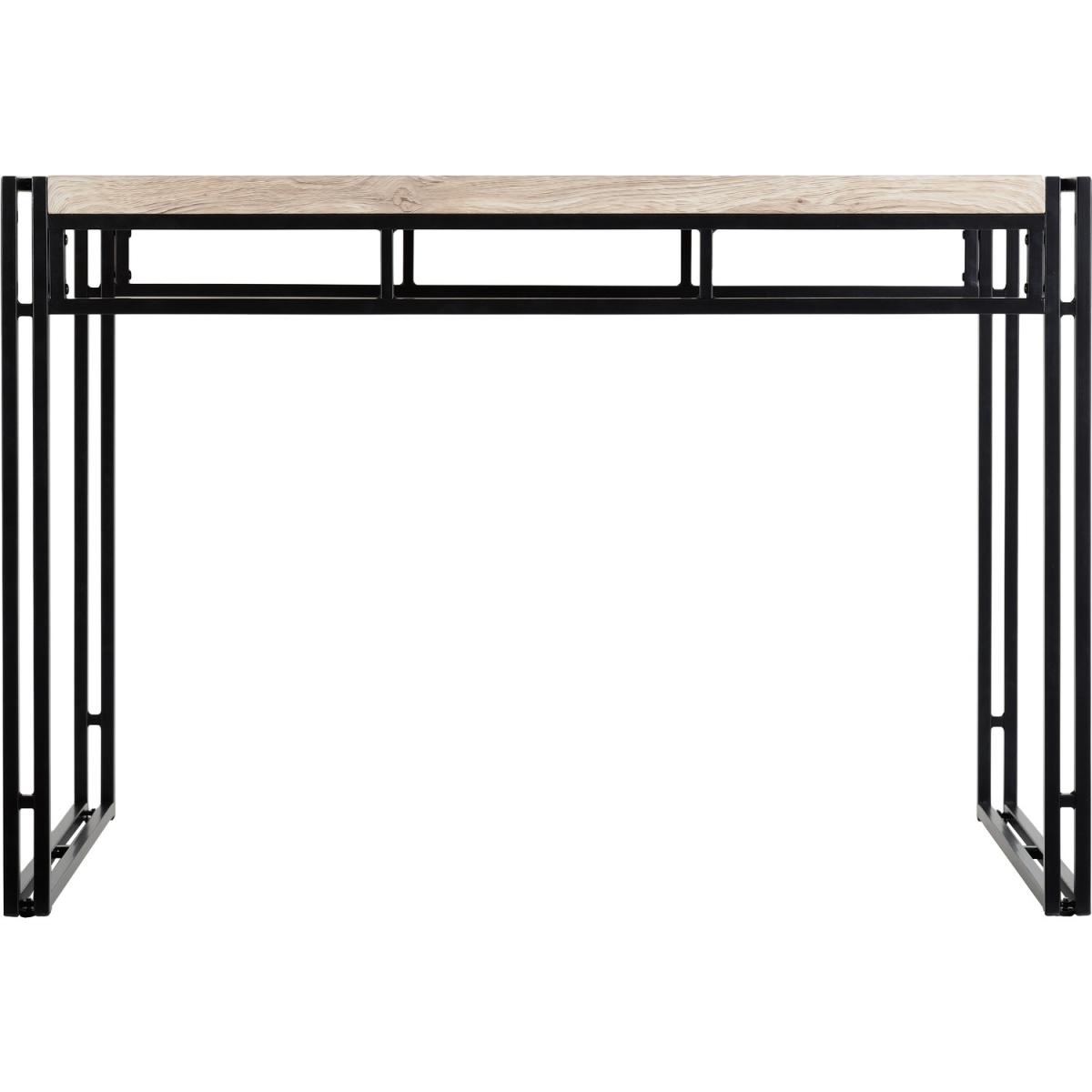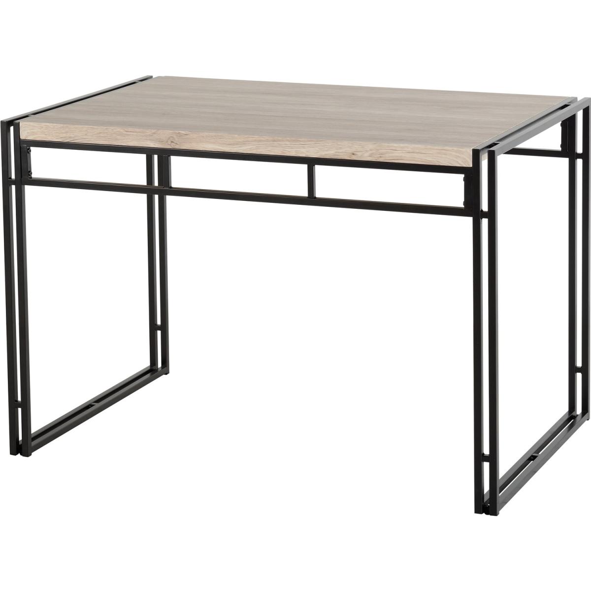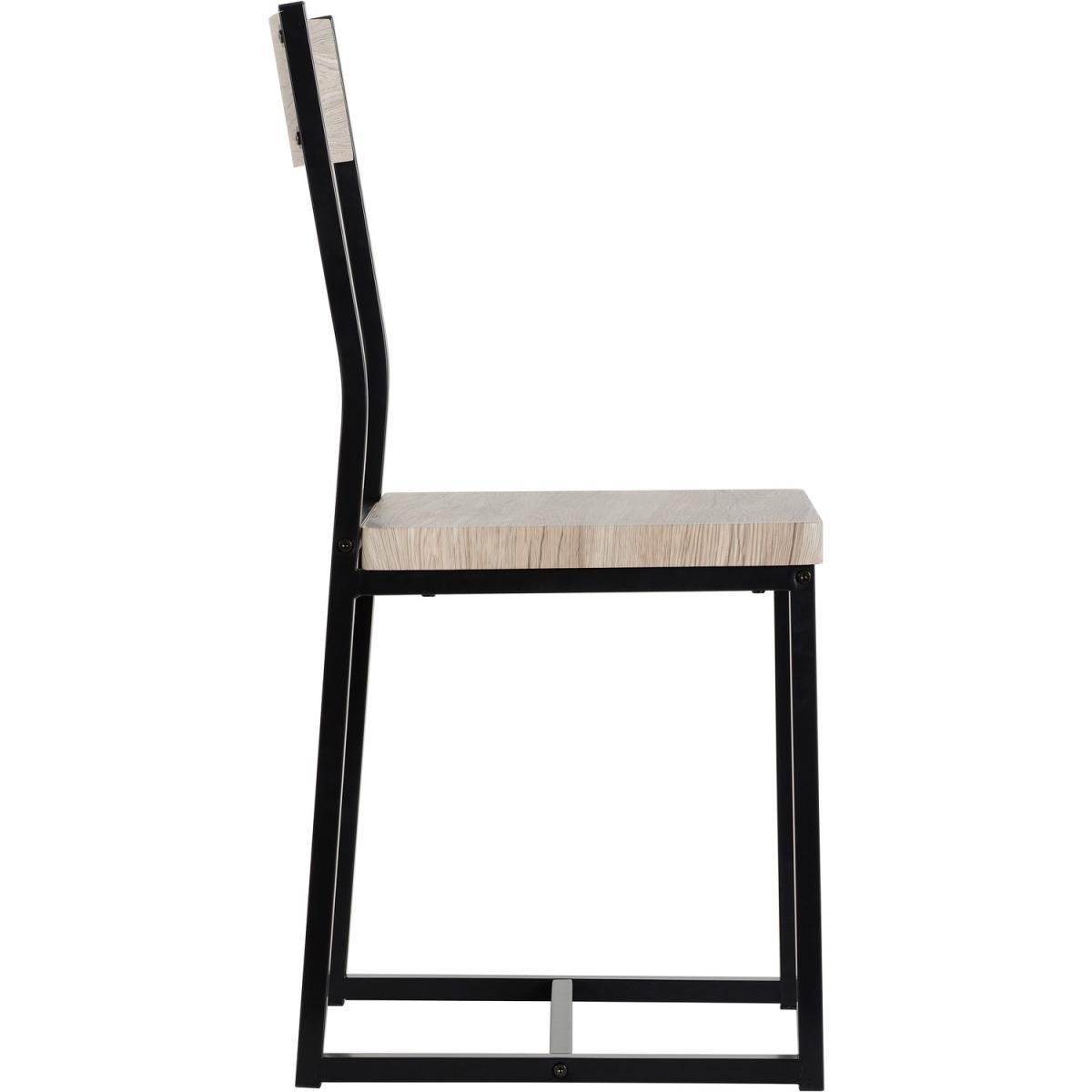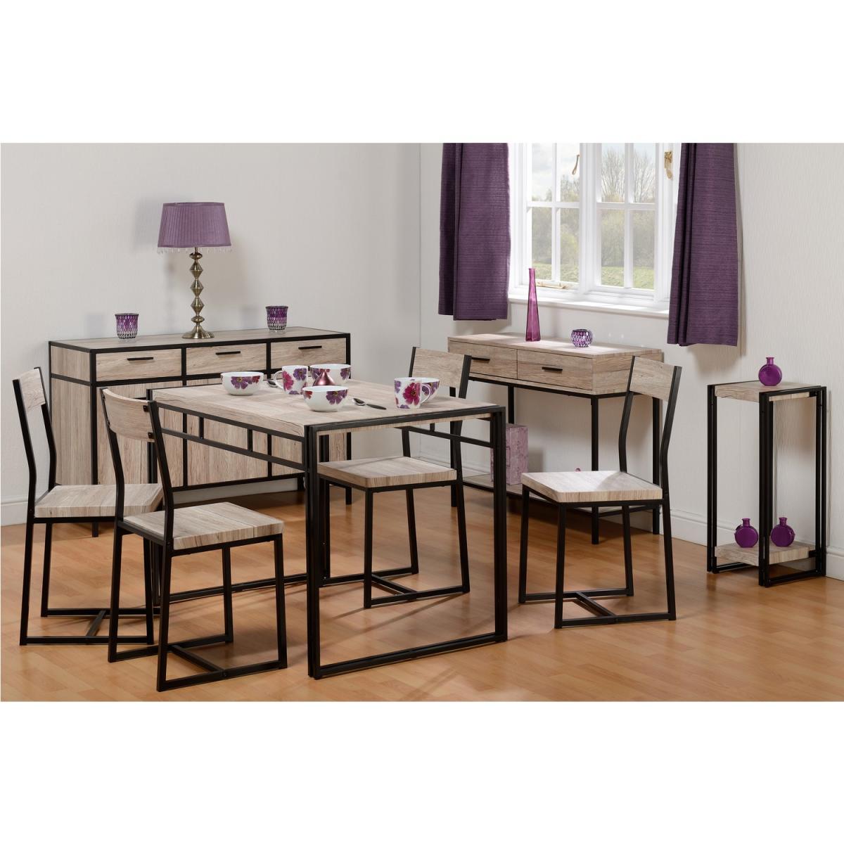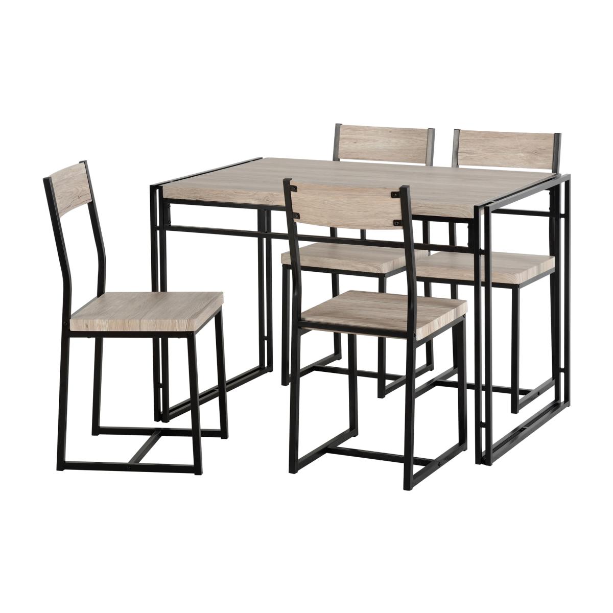 Dimensions Table Dimensions - W 110cm x D 75cm x H 75cm Chair Dimensions - W 38cm x D 44cm x H 85cm Features. Oak effect Dining table set with metal frame1 Dining table and 4 chairs. Industrial style. Part of the Warwick range. Assembly required..