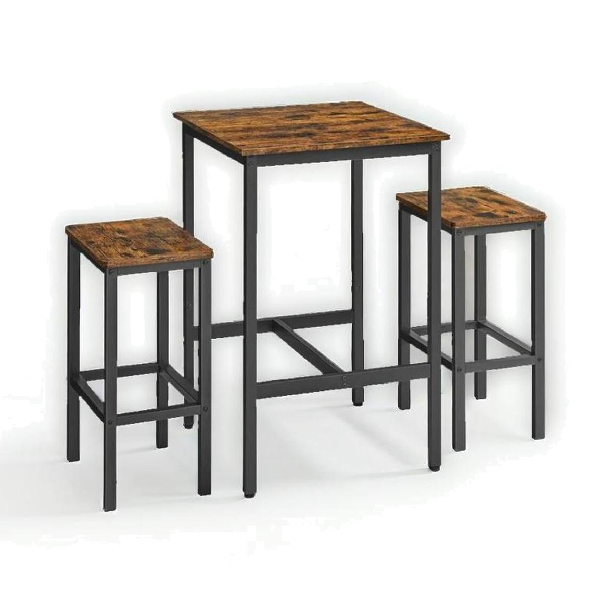 This versatile bar table set is a stylish and practical addition to any home, offering multiple uses from a cozy dining nook to a chic coffee bar or even a compact workspace. The set includes a dining table measuring 60 x 60 x 90 cm and two bar stools, each sized at 30 x 40 x 65 cm, making it ideal for small spaces. The stools can be neatly tucked under the table when not in use, saving valuable floor space. Constructed with high-quality particleboard and a sturdy steel frame, this set is built to last. The table's adjustable feet and the stools' anti-tip pads provide extra stability, ensuring that everything stays securely in place. Both the table and stools feature footrests, adding an extra layer of comfort so you can relax and enjoy your time seated.