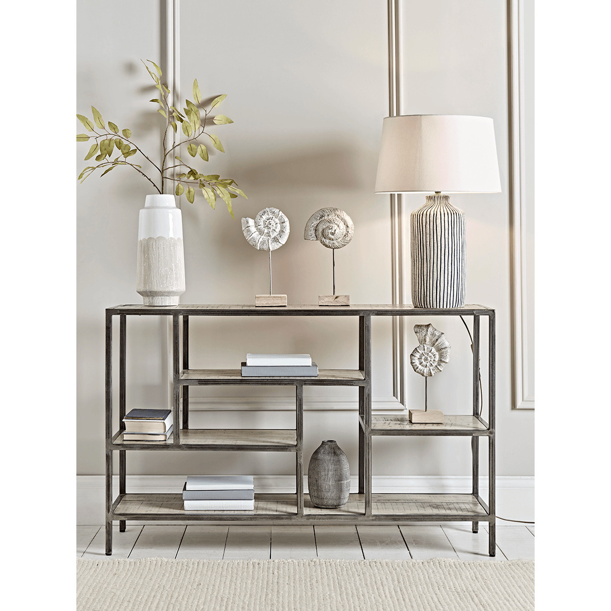 Crafted from iron with an authentic industrial finish, our large versatile console will bring a contemporary touch to your interior - one that, by the characterful mango wood shelves, will not appear too cold. An open frame comprising of modular sections is perfect for storing and displaying a variety of items, from books to decorative objects, and a generous tabletop surface allows for a feature table lamp and statement faux.