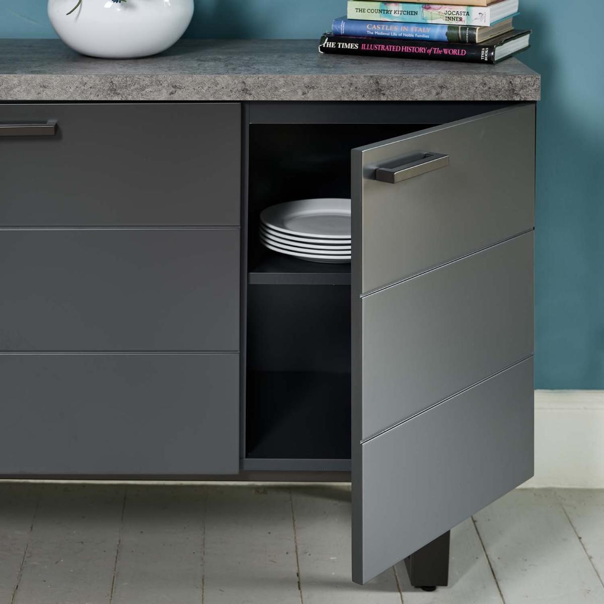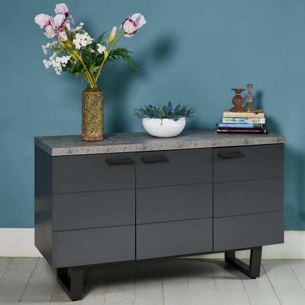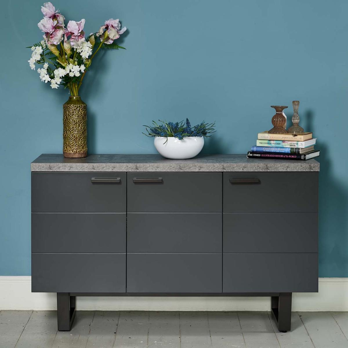 The Industrial Large Sideboard is strong and great for storage. The faux concrete effect top gives it a modern edge that is perfect for displaying your trinkets and ornaments on. With three compartments, each containing their own shelves, you won't be left wanting for more hidden spaces to tidy away your belongings. Its versatile industrial style makes it perfect for either the living or dining room - or even the hallway - depending on what you plan to store inside.