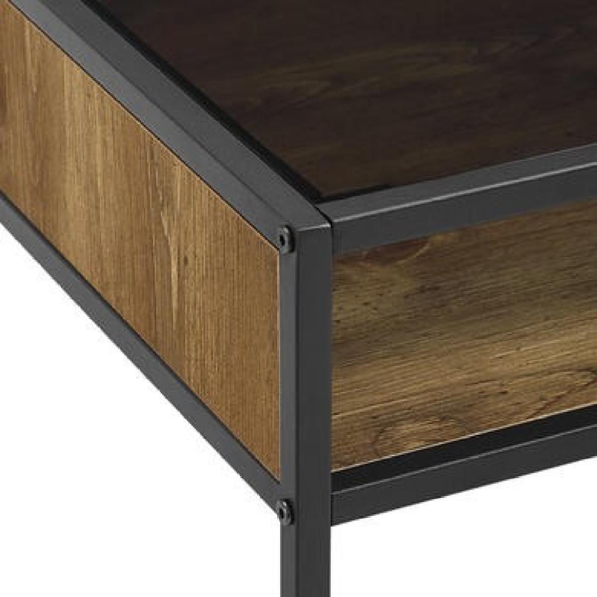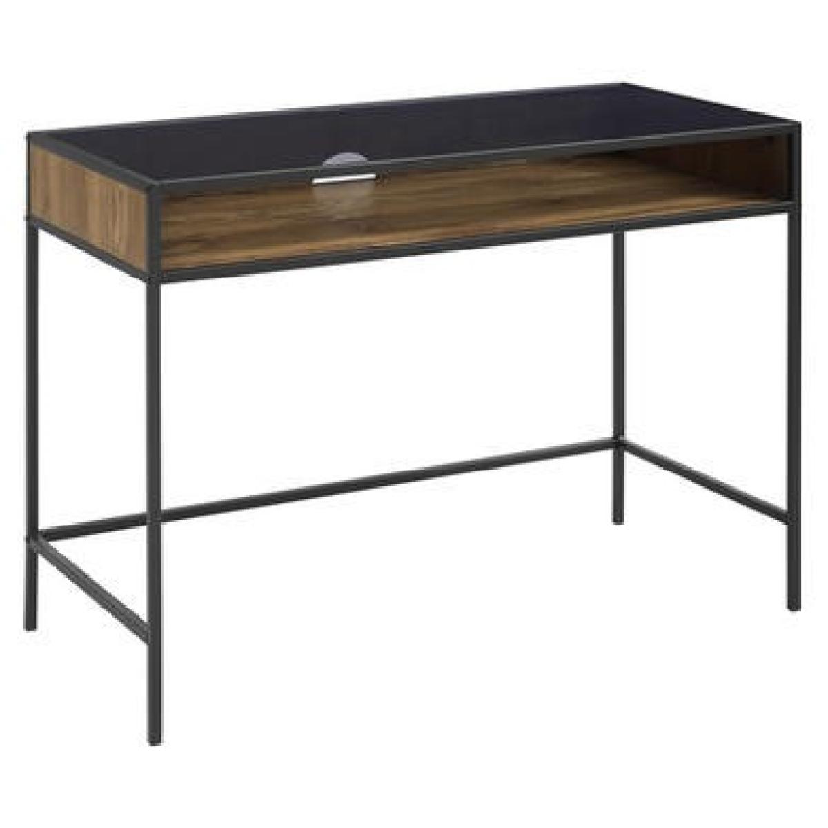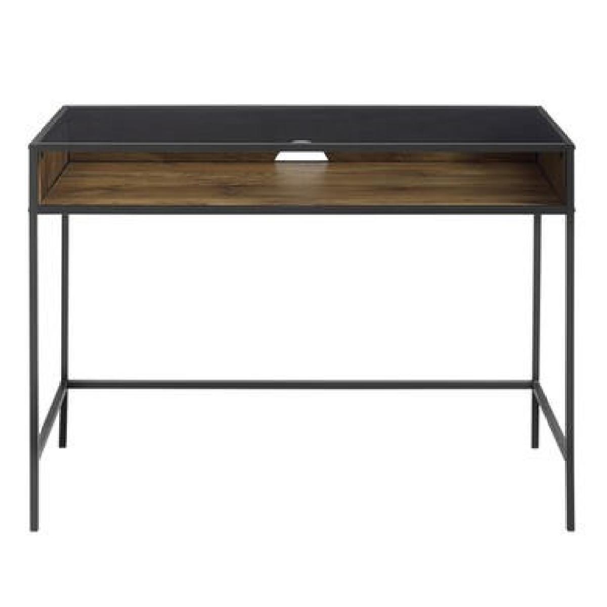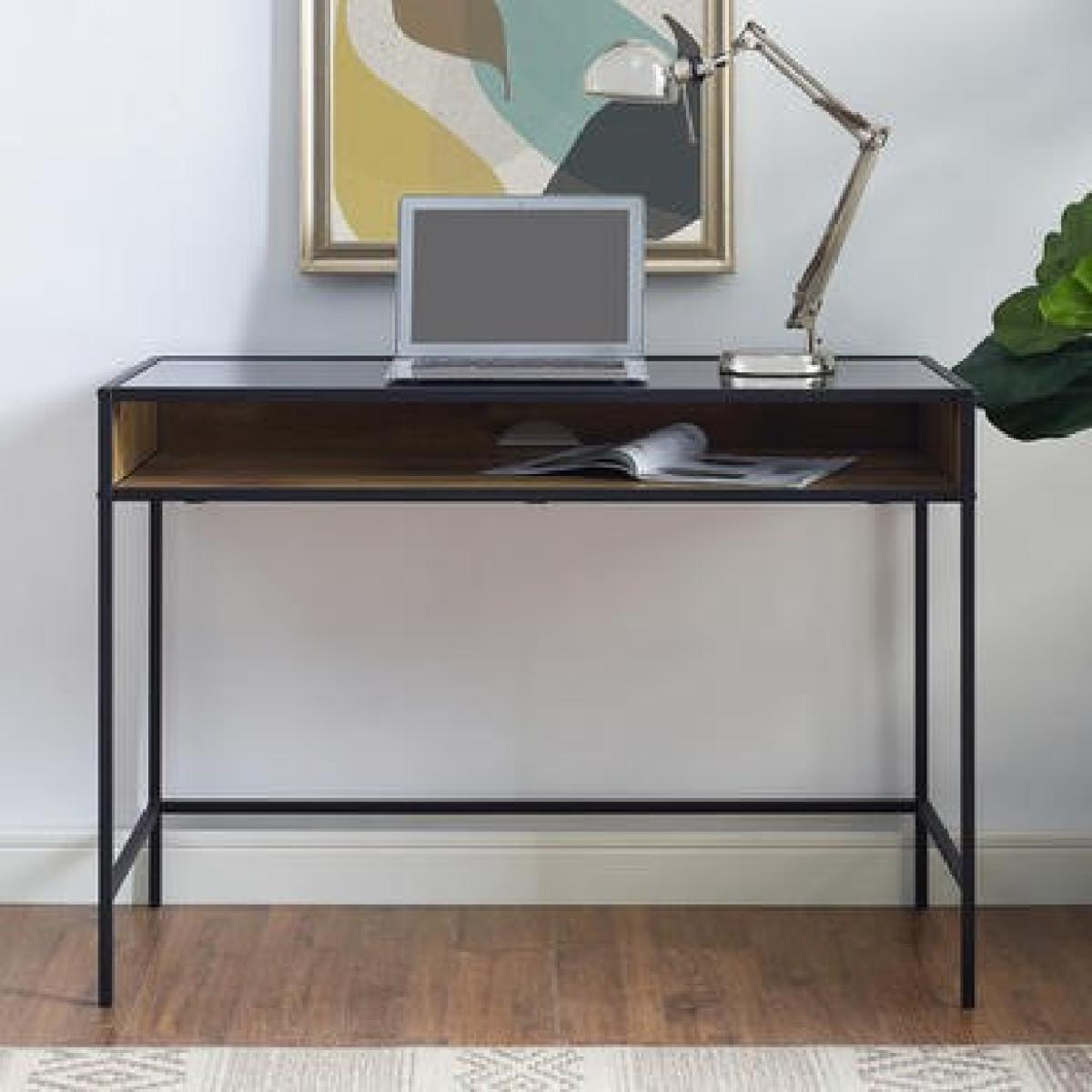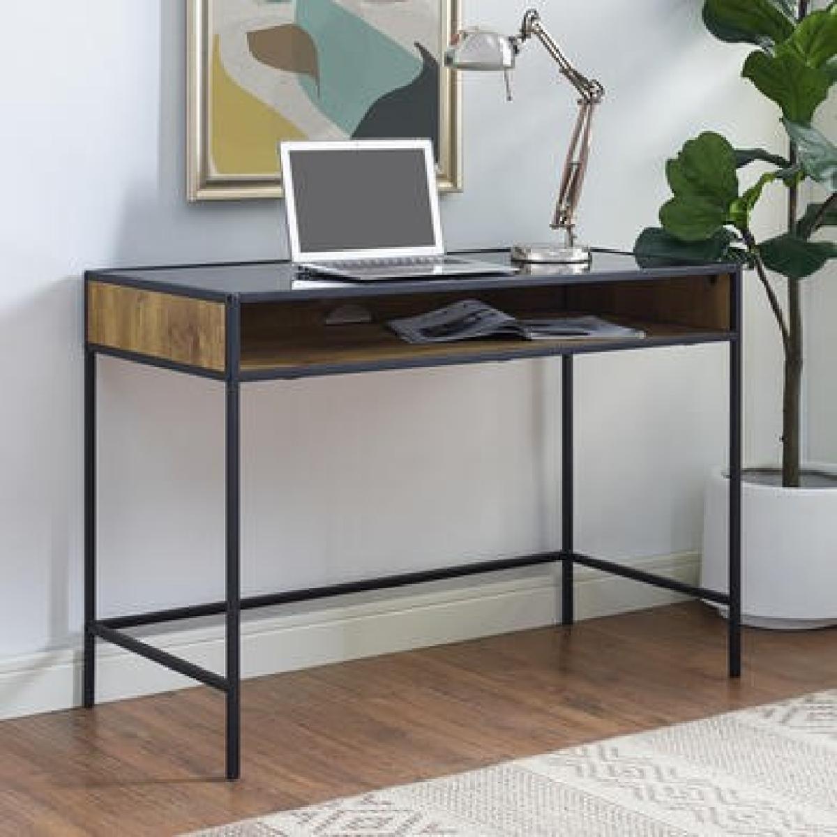 Dimensions H76 x W107 x D51 cm Features. Made with an open laminate shelf black metal frame and tempered glass tabletop. Showcases an urban industrial style with mixed material design. Perfect as a work desk or a vanity in your home office or bedroom. The open shelf provides a perfect spot for your office supplies. Features a cable management hole in back to organize wires from your electronics Easy assembly..