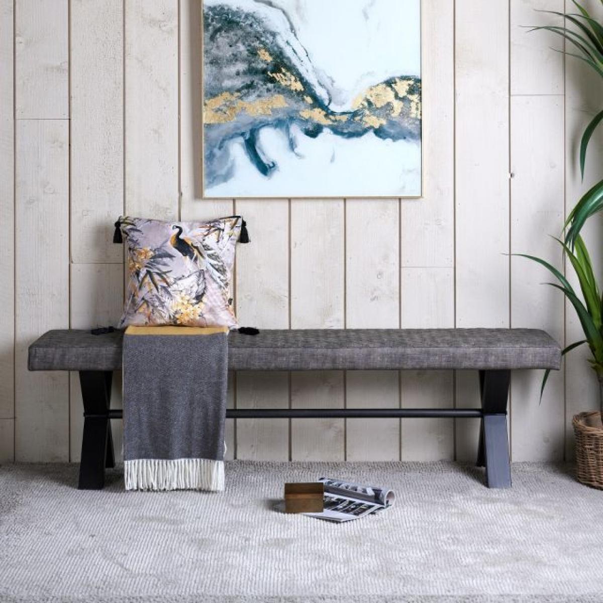 The Industrial grey upholstered dining bench with its modern textured grey tones and diamond stitched upholstery is the perfect accompaniment to the concrete effect Industrial Dining Table, or indeed any table with a more rustic urban style. Available in 140cm and 180cm sizes, there is plenty of room to seat friends and family in a sociable dining setup. Available in 140cm and 180cm long. Sturdy cast metal black criss cross legsSoft diamond stitched upholstery. Dimensions: H45cm x L180cm x D35cm Simple self assembly