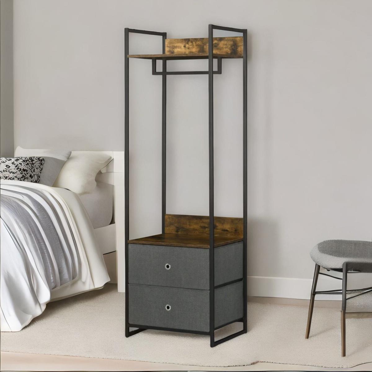 This versatile wardrobe combines a garment rail and two drawers, providing an efficient solution for both hanging and folding clothes. Perfect for bedrooms or as a storage unit in the hallway. The top metal rail can support up to 5kg, ideal for hanging shirts, dresses, light coats, and trousers. Additionally, the shelf above the rail offers convenient extra storage space. Equipped with two fabric drawers, this wardrobe offers ample storage for t-shirts, trousers, tops, underwear, and other garments. The cut-out ring handles ensure easy opening and closing. Anti-tipping straps are included to securely attach the wardrobe to a wall or similar surface, enhancing safety. Measuring 185. H x 58W x 46. D cm, this wardrobe provides plenty of storage space. The inner dimensions of each drawer are 10. H x 39W x 30. D cm, ensuring ample room for your belongings.