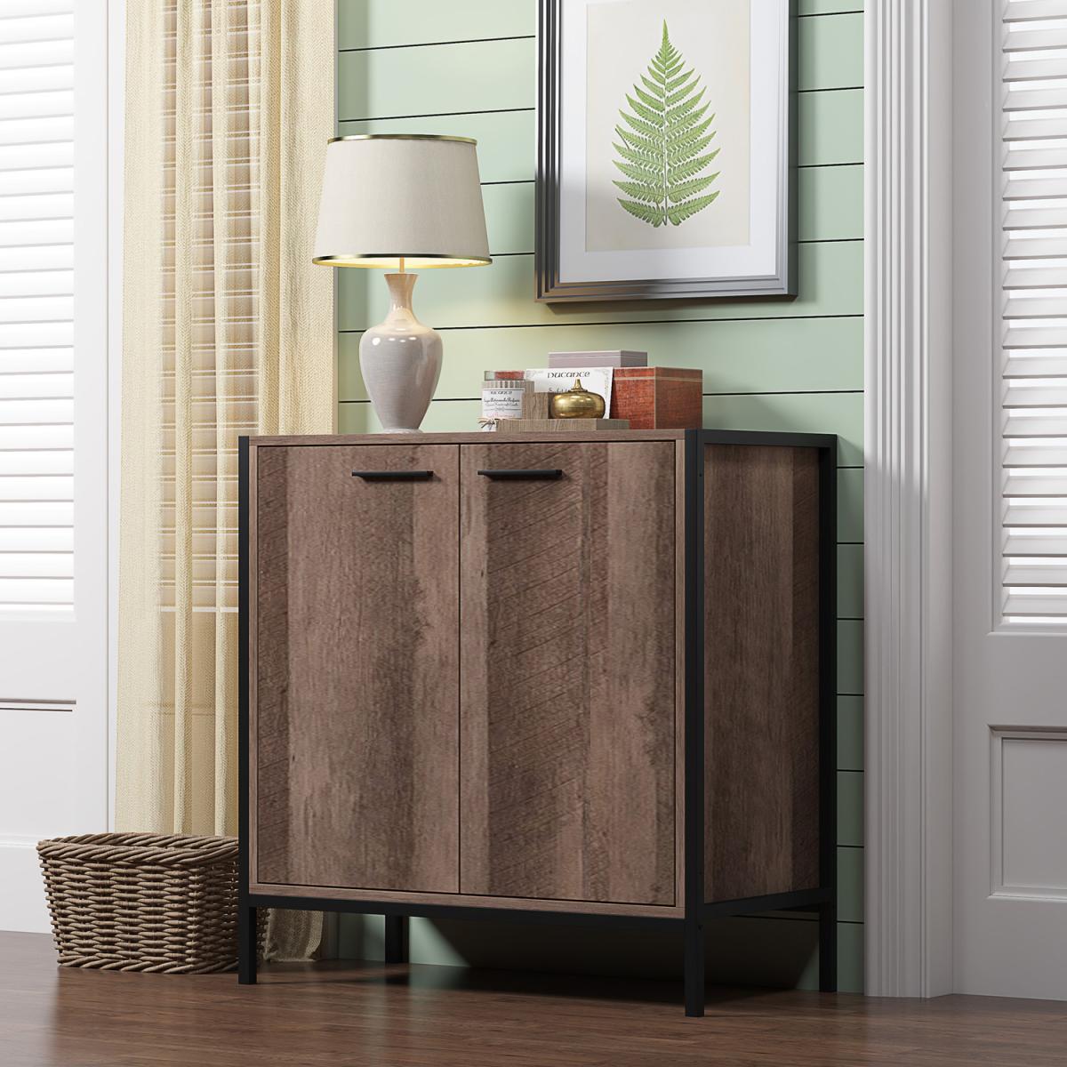 Introducing our Industrial Inspired 2 Door Large Sideboard, a striking piece that effortlessly combines industrial aesthetics with functional storage. This sideboard is designed to bring a touch of elegance and versatility to your living space, showcasing exceptional craftsmanship and attention to detail. The sideboard features an elegant brown wood grain effect finish that adds a touch of natural beauty and sophistication to your home decor. The warm and inviting tones of the wood grain create a cozy and welcoming ambiance, making it a perfect addition to any room. Complementing the wood grain finish is a sturdy black powder-coated metal frame that adds a modern industrial touch to the design. The contrast between the metal frame and the wood grain creates a visually captivating look that effortlessly captures attention and enhances the overall aesthetic appeal of the sideboard. To ensure stability and durability, the sideboard stands on four strong metal feet. These feet provide excellent support and contribute to the robustness of the piece. Not only do they enhance the overall strength and stability of the sideboard, but they also add a touch of industrial charm to its design. The sideboard features two large doors adorned with sleek metal pull-style handles. These handles not only offer a convenient grip for opening and closing the doors but also serve as stylish accents, adding a refined touch to the industrial-inspired design. Inside the sideboard, you'll find ample storage space to keep your belongings organized. The two large doors open to reveal generous storage compartments, allowing you to store a variety of items, from dinnerware and table linens to books, electronics, and more. This practical storage solution helps you maintain a clutter-free environment while keeping your essentials within easy reach.