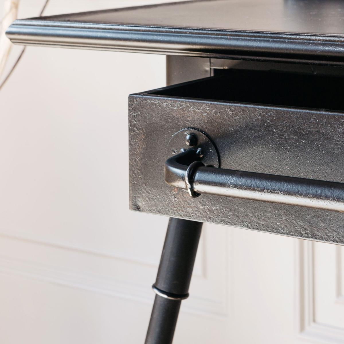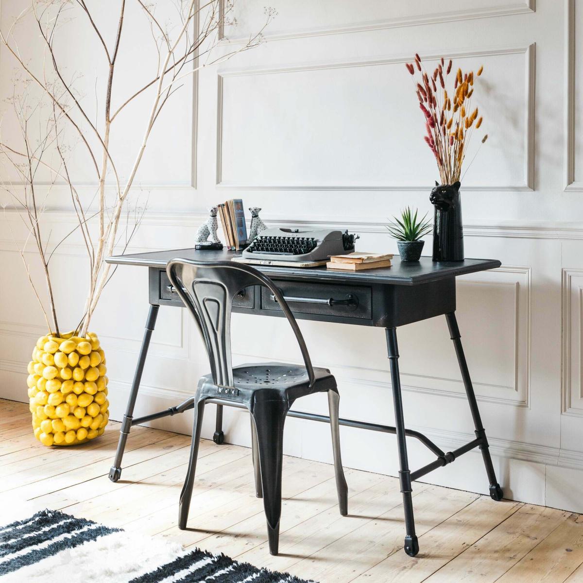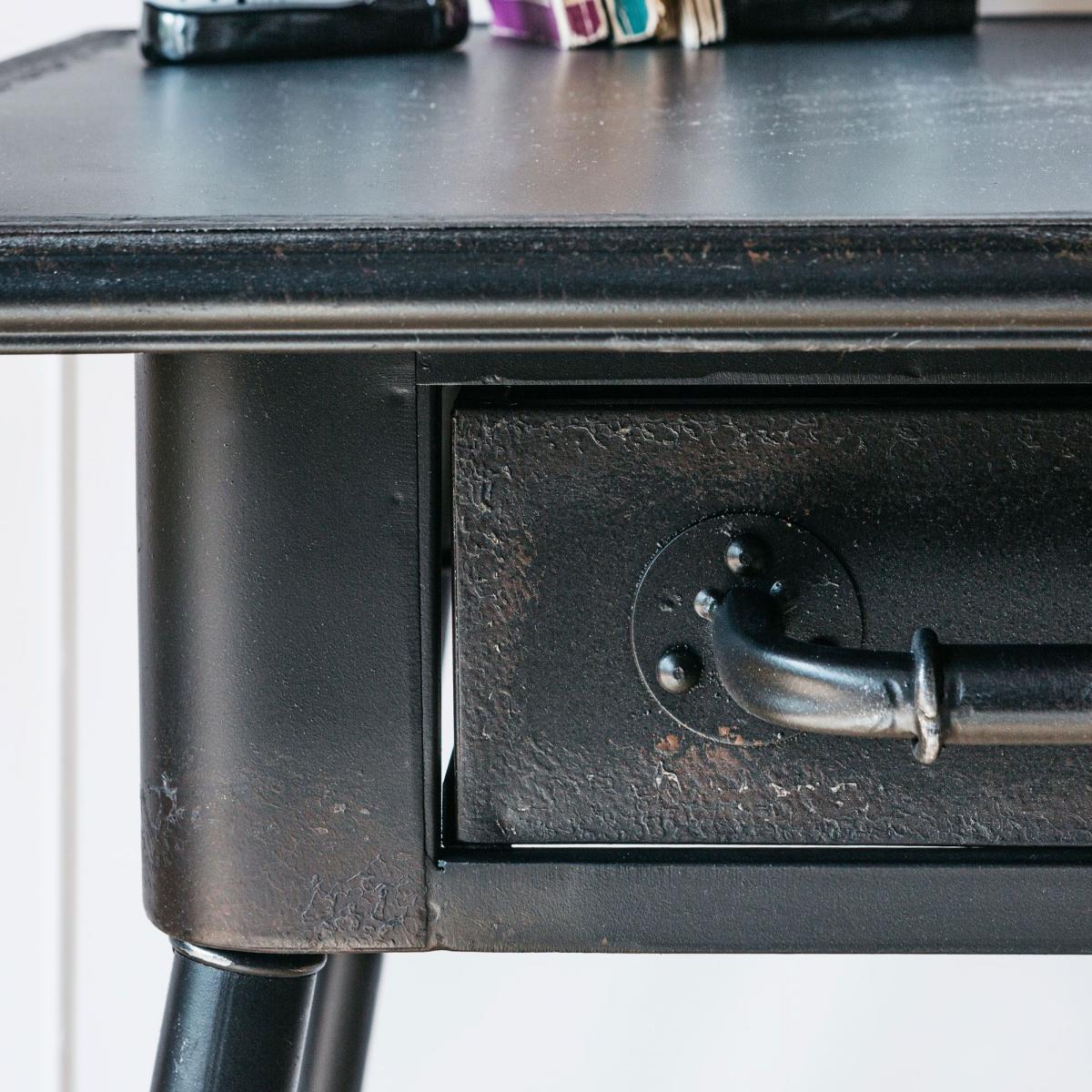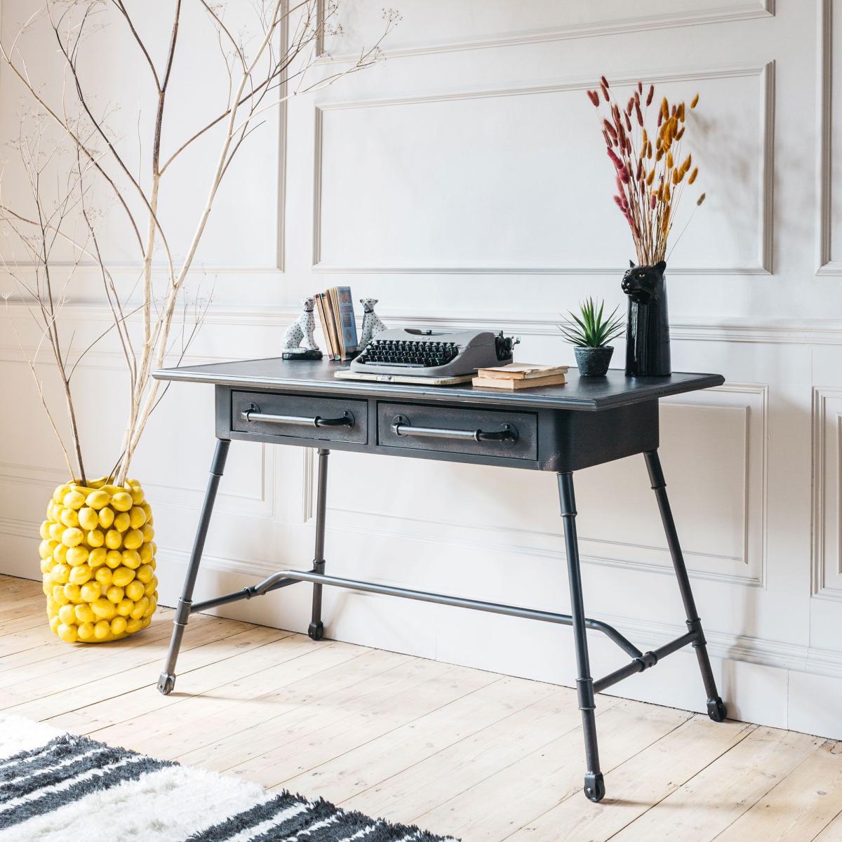 An industrial-inspired iron desk for an industrious home office environment. With a black distressed finish and sturdy pipe drawer handles, this desk will keep you feeling productive and organised.