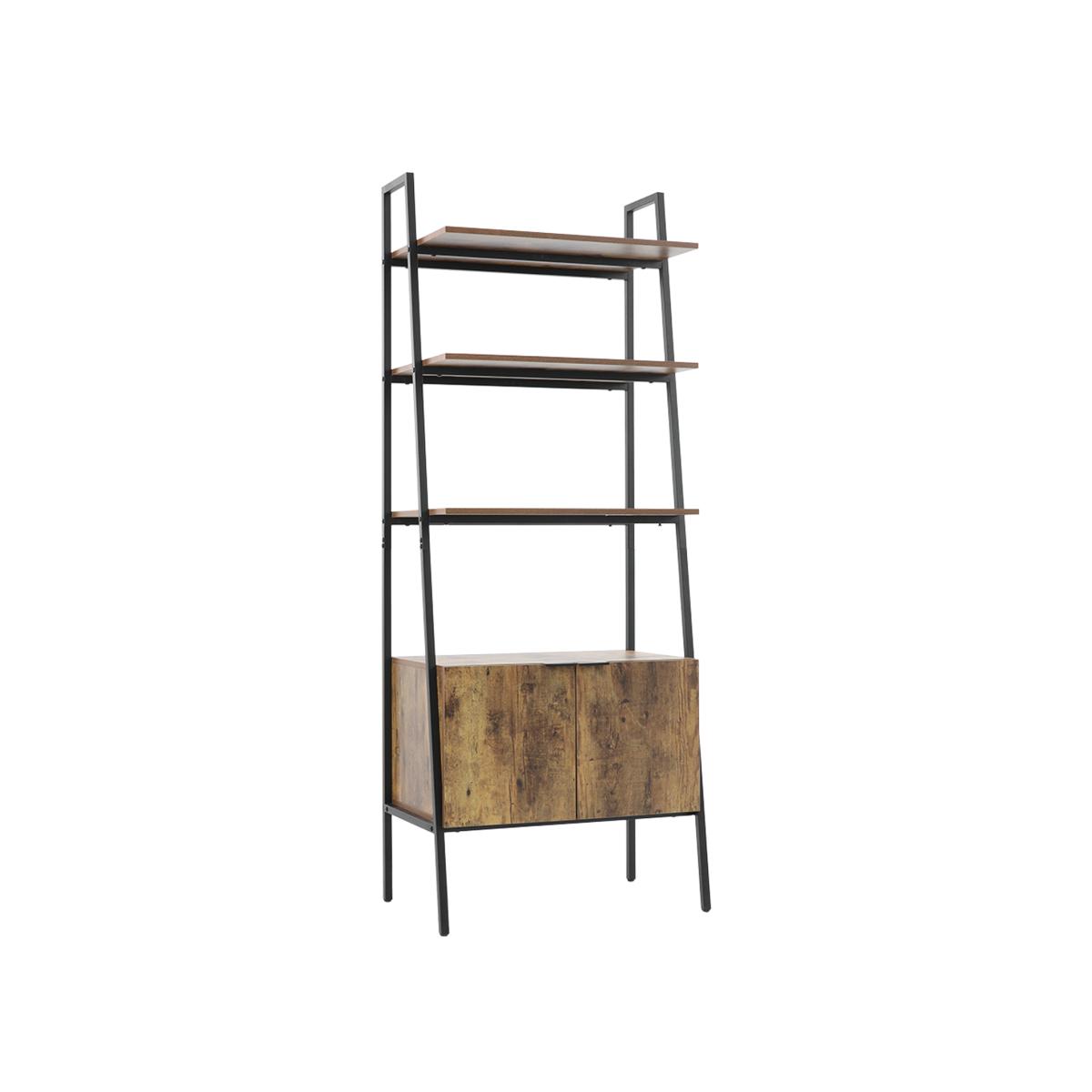 This ladder bookcase offers a blend of open shelving and hidden storage for books, decor and daily essentials. The double-door cabinet keeps items neatly tucked away while the three shelves provide ample display space. Its sturdy metal frame and ladder structure ensure reliable support and reduced wobbling. Designed to sit flush against the wall, it maximises vertical space in living rooms, bedrooms or offices. The industrial style brings a modern, retro-inspired look to any interior.