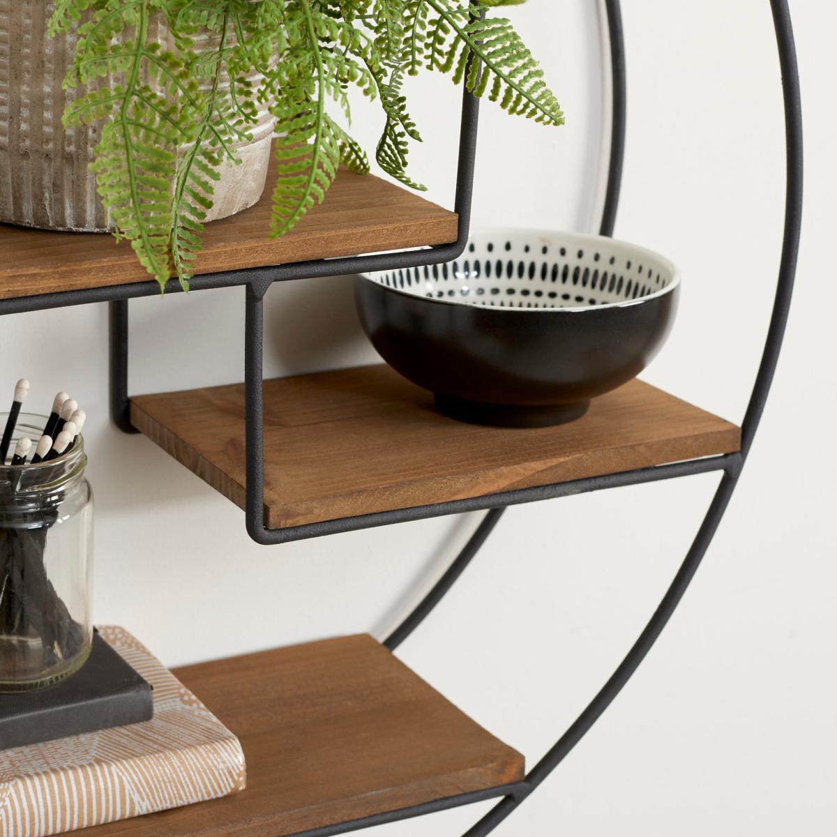 I really like this large circle shelf for adding a contemporary yet industrial touch to your space. Its dark brown finish gives it warmth and versatility, making it suitable for various interior styles, from modern minimalism to rustic industrial. It works particularly well in open-plan living areas, bedrooms, or home offices where you want to create a focal point. For styling tips, keep it uncluttered by displaying a few carefully chosen decorative objects, small plants, or books, which will soften the industrial vibe and keep your shelves looking organised. Its circular shape adds visual interest to the wall, making it not just functional but also a statement piece.