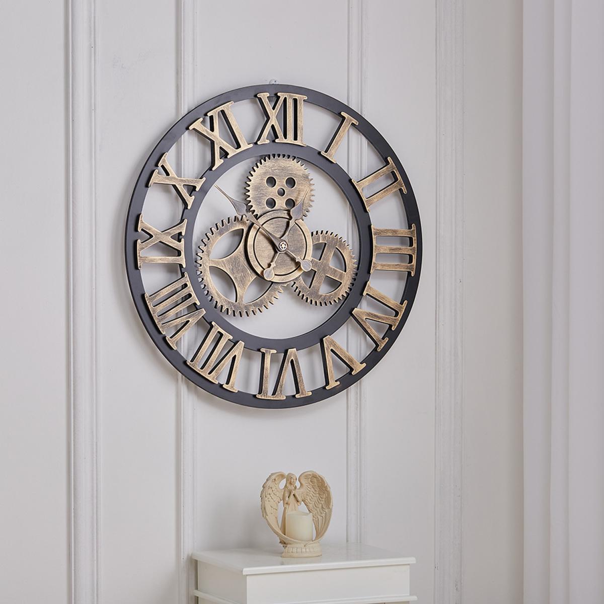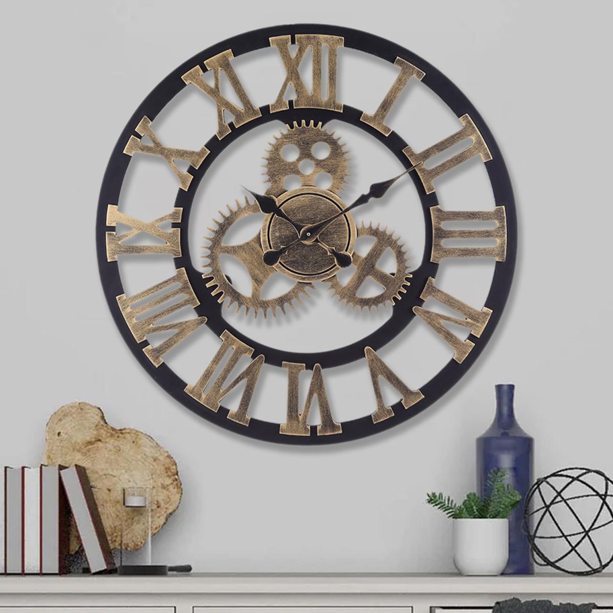 Large Roman Numerals and exquisite gear characterize this metal black and gold wall clock to form a steampunk style piece. With the brushed gold and black finish, the brilliant wall clock will look great in any home and office. Crafted from metal, the clock is easy to hang. You can watch the hands sweep through the gears as soon as you put it up the wall.