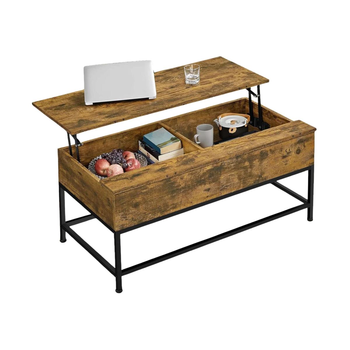 Our coffee table boasts a unique split lift-top design, featuring a pneumatic-lift top on one side and a fixed surface on the other. This innovative design allows you to bring the tabletop closer to you while relaxing on the couch, while still providing a stable surface for cups, dishes, and laptops. With easy-to-follow assembly instructions and all necessary parts and tools included, setting up this coffee table is a breeze. Plus, the water-resistant surface ensures easy cleaning, making maintenance a simple task. Embrace the rustic-industrial aesthetic with our coffee table, which showcases a weathered finish and a matte black metal base. The combination of wood and metal elements creates a striking contrast, adding character to any lodge or modern farmhouseindustrial setting. Crafted with care, our lift-top coffee table features a powder-coated metal base, E1 MDF main body with a water-resistant veneered surface, and a sturdy metal pneumatic lifting mechanism, ensuring durability and stability. To prevent accidental scratches or scuffs, our coffee table comes equipped with 4 plastic feet that can be adjusted to accommodate uneven floors. These screw-in feet help to level the table and protect your floors during use.