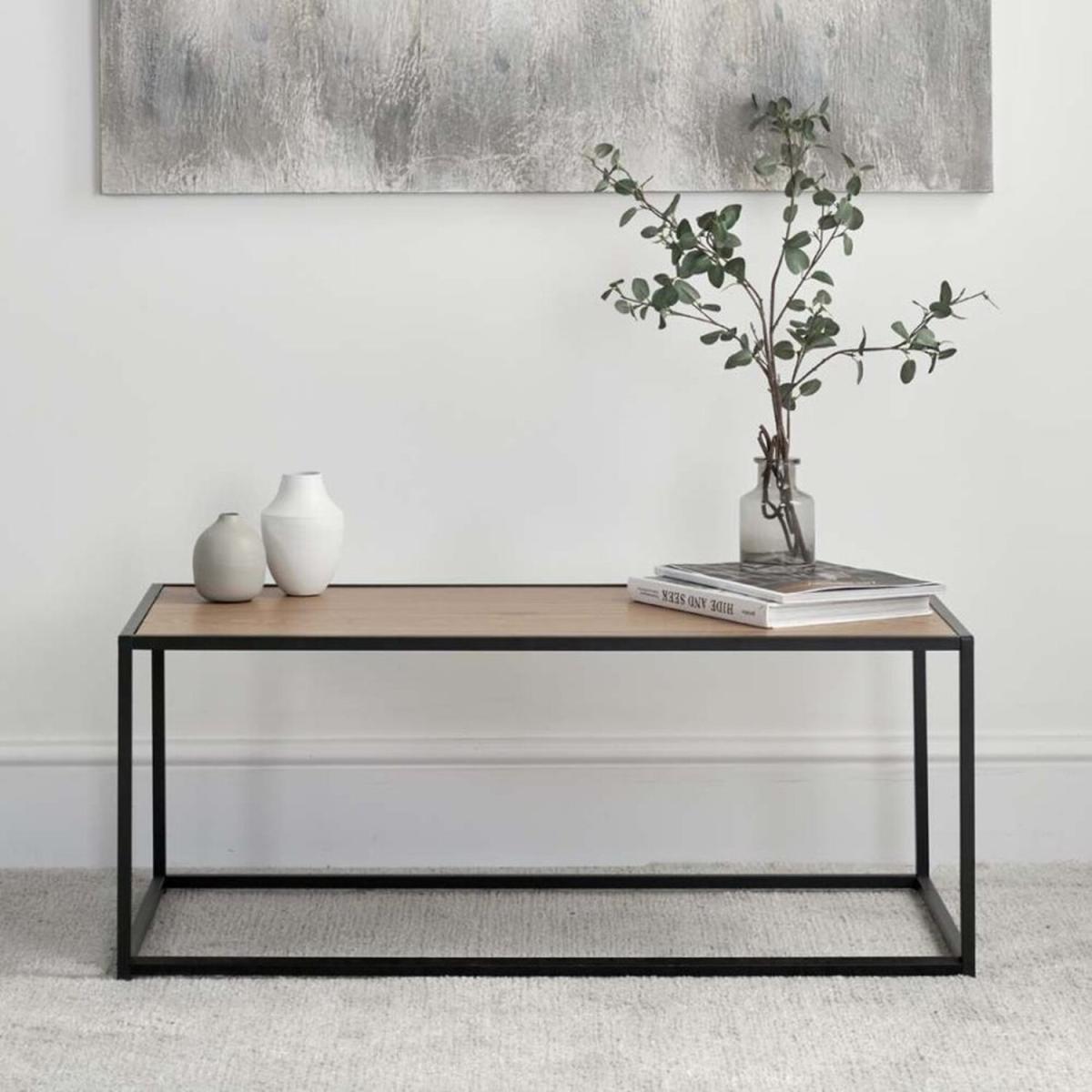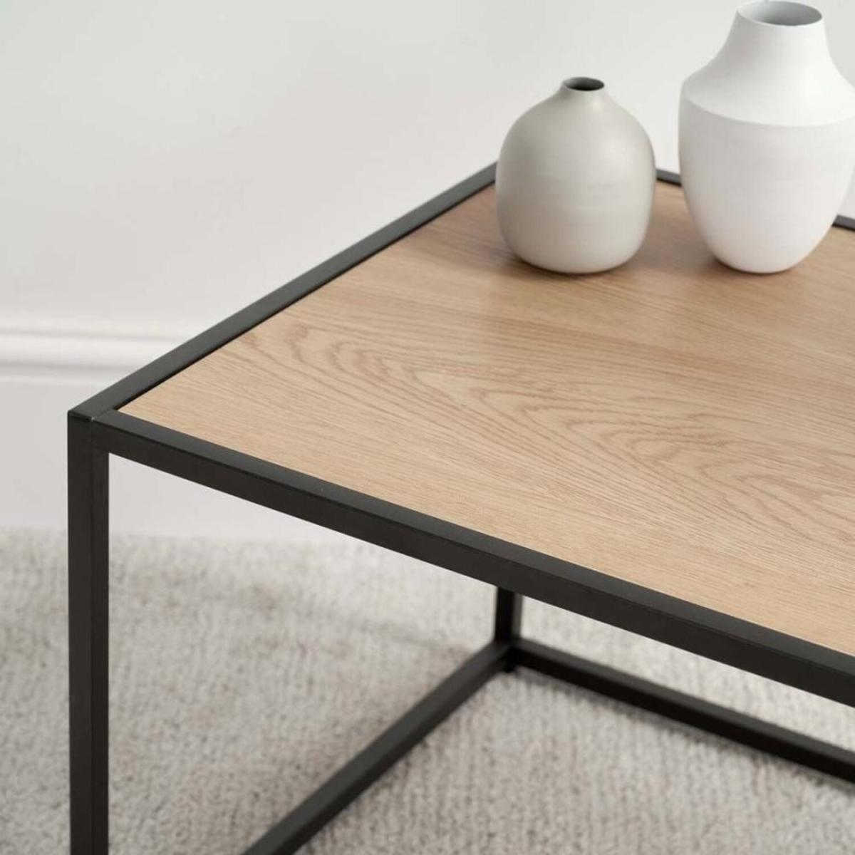 Finish out your living area by adding this modern centrepiece. Light in its construction and look, you can get the most out of your space with this contemporary coffee table. With inspiration from industrial design, it features a black powder-coated metal frame and a tabletop with a wild oak look.