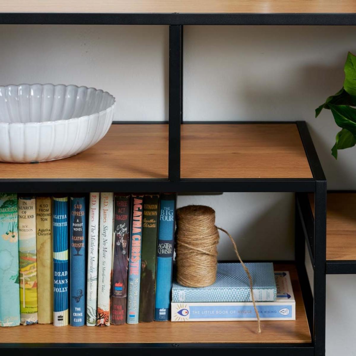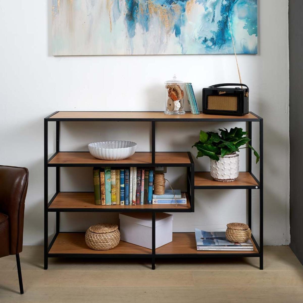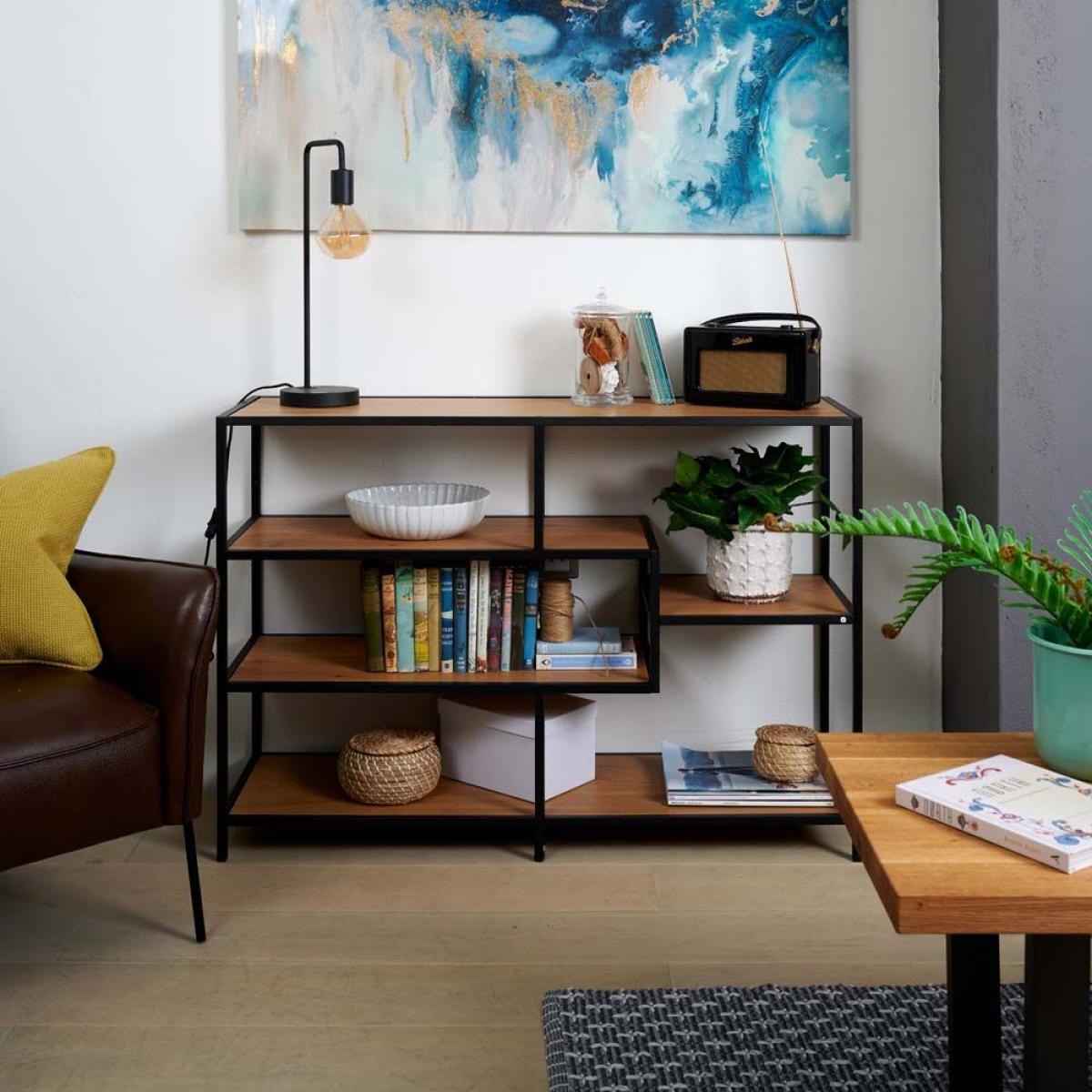 I love this industrial-style low bookcase for its clean lines and versatile profile, making it an ideal addition to both modern and eclectic interiors. Its open shelving offers practical storage and display space, perfect for books, plants, or decorative objects. It works especially well in living rooms, home offices, or even bedrooms where space is limited but style remains a priority. To style it effectively, I recommend layering objects of different heights and textures to create visual interest without cluttering. Pairing it with warm wood tones or metal accents can enhance its industrial feel, while a few colourful accessories will add personality and a touch of warmth. Overall, it’s a practical yet stylish piece that adds a contemporary edge to any space.
