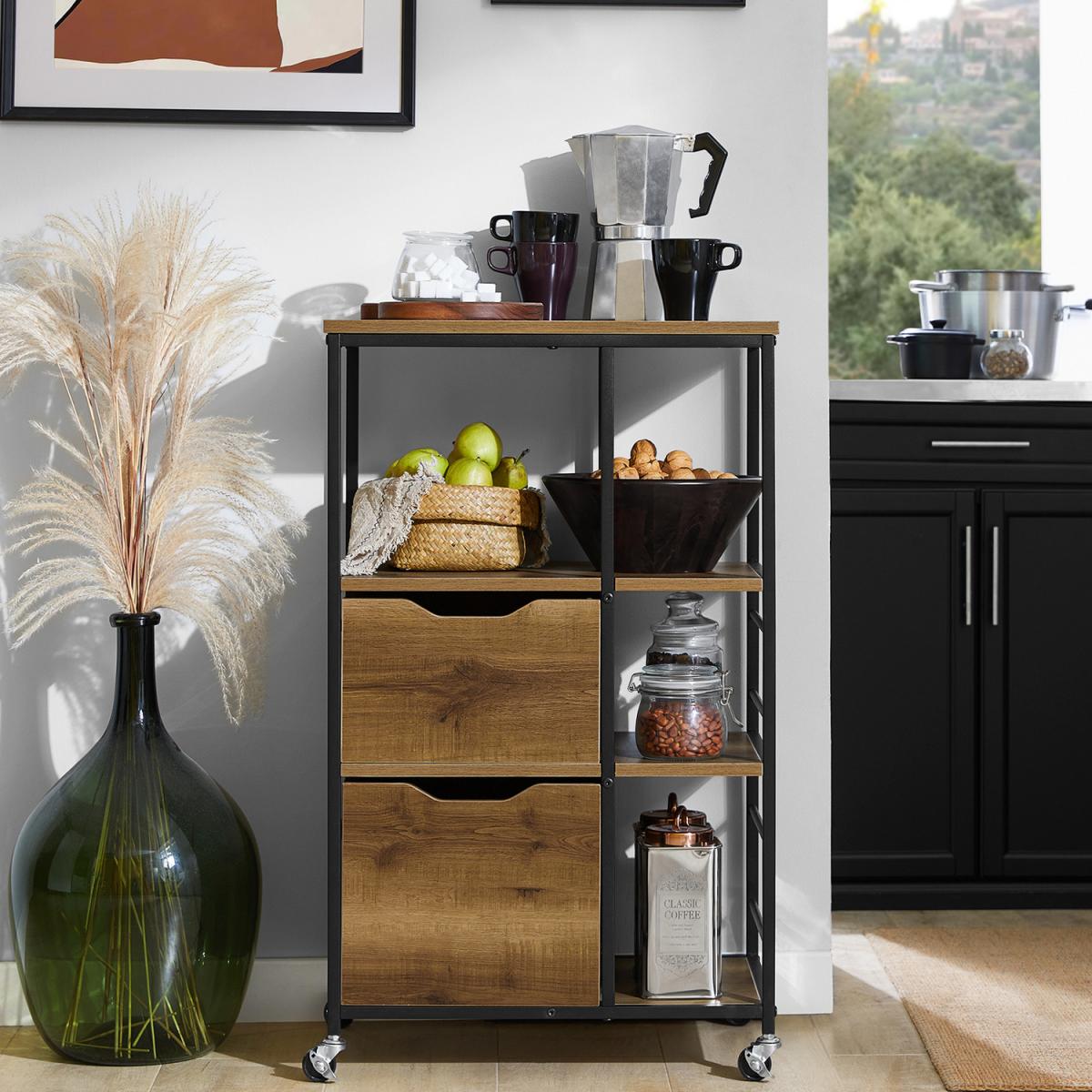 This Industrial Vintage Style Serving Trolley creates a distinctive and modern atmosphere and adds more storage space to your home. The top and 3 shelves below provide ample storage space for the items you might need in reach. 2 drawers offer additional storage space for you. With 4 wheels (2 with brakes), you can move the trolley around your home easily. Made of high quality particle board with wooden effect and black powder coated steel frame. Stylish and functional, this trolley is perfect for your kitchen, living room and other places that need extra organization.