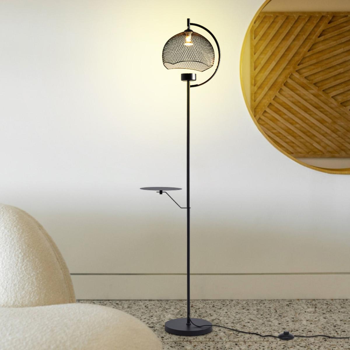 Selected with care, these lamps are not just for illumination but also enhance the style and sophistication of your home decor. This floor lamp brings a modern minimalist charm to your space with its tall, slender pole and chic mesh lampshade, finished in black. Its harmonious design makes it a striking focal point. Additionally, the lamp features a versatile display area, ideal for showcasing decorative items, potted plants, and framed photos.