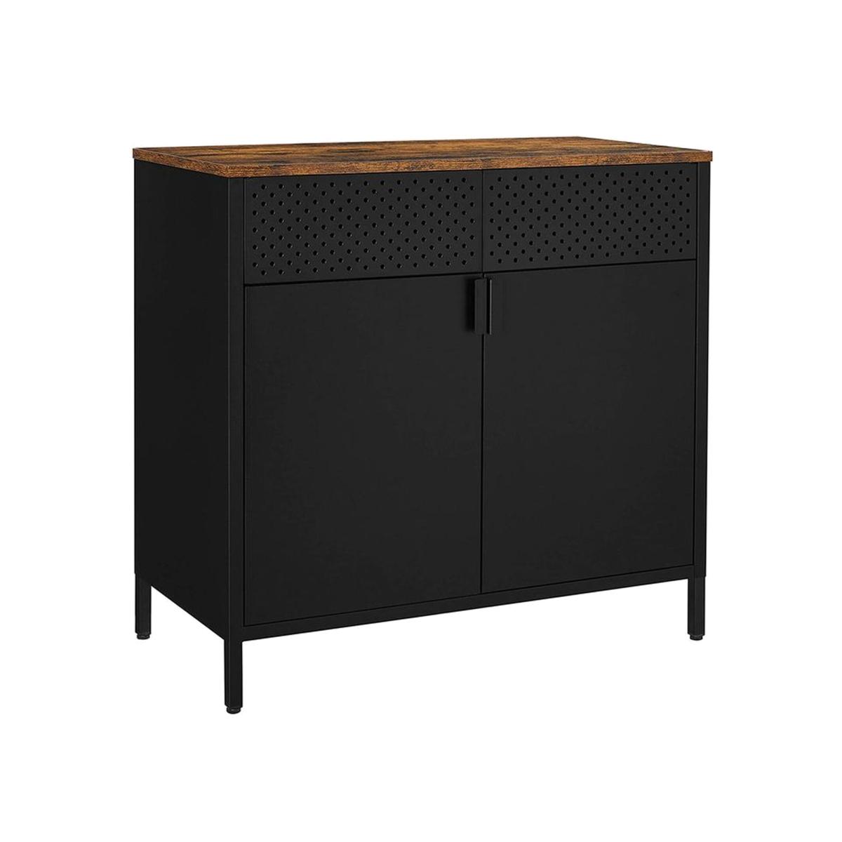 With its rustic brown wood-look top and sleek black steel frame, this storage cabinet adds an eye-catching industrial touch to any space. Display decor or essentials on the tabletop, and tuck away clutter behind the doors. The interior shelf is height-adjustable, so you can tailor the space to fit your needs. Crafted from sturdy particleboard and supported by a durable steel frame, this cabinet is designed to provide long-lasting stability and reliability. Uneven floors, no problem. The adjustable feet help keep the cabinet level and steady without the need for repairs or makeshift solutions. Includes one industrial-style storage cabinet, clearly labeled parts, easy-to-follow instructions, an anti-tip kit for added safety, and ventilation holes for breathability, plus, a more organised home.