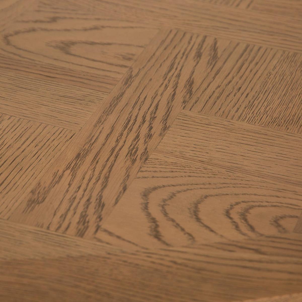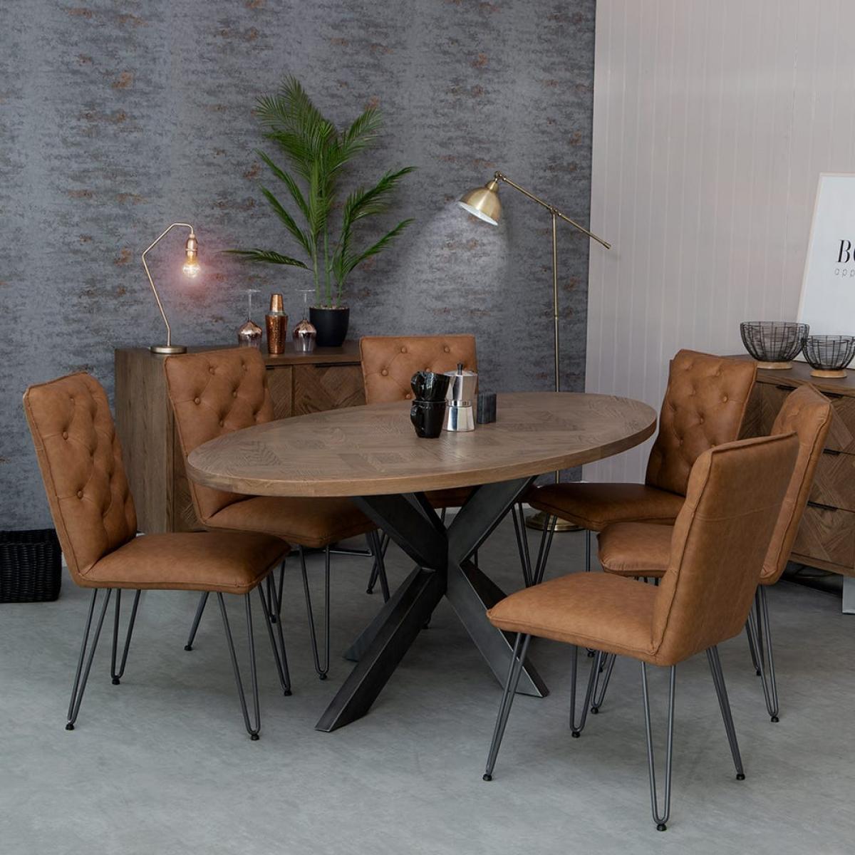Our Industrial oak 2m oval dining table is a sophisticated centrepiece to an evening’s entertainment. The elegant shape is enhanced by our oak and oak veneer table top, which is inlaid with a basket-weave pattern. The quartet of striking straight legs fans out from the centre to add both stability and style. Whether you’re hosting Sunday lunch or a weekday supper, your guests will need no convincing to get cosy around this table. Its ample length means you can host up to eight with ease, while the attractive oak surface makes the ideal backdrop to your tastiest sharing plates and salads.