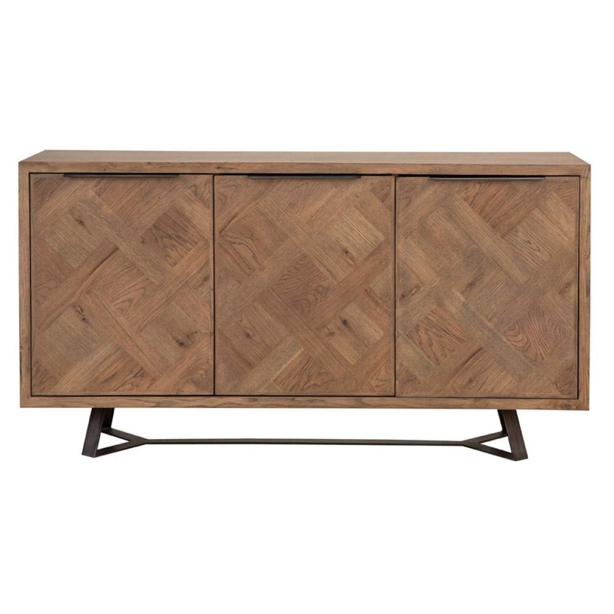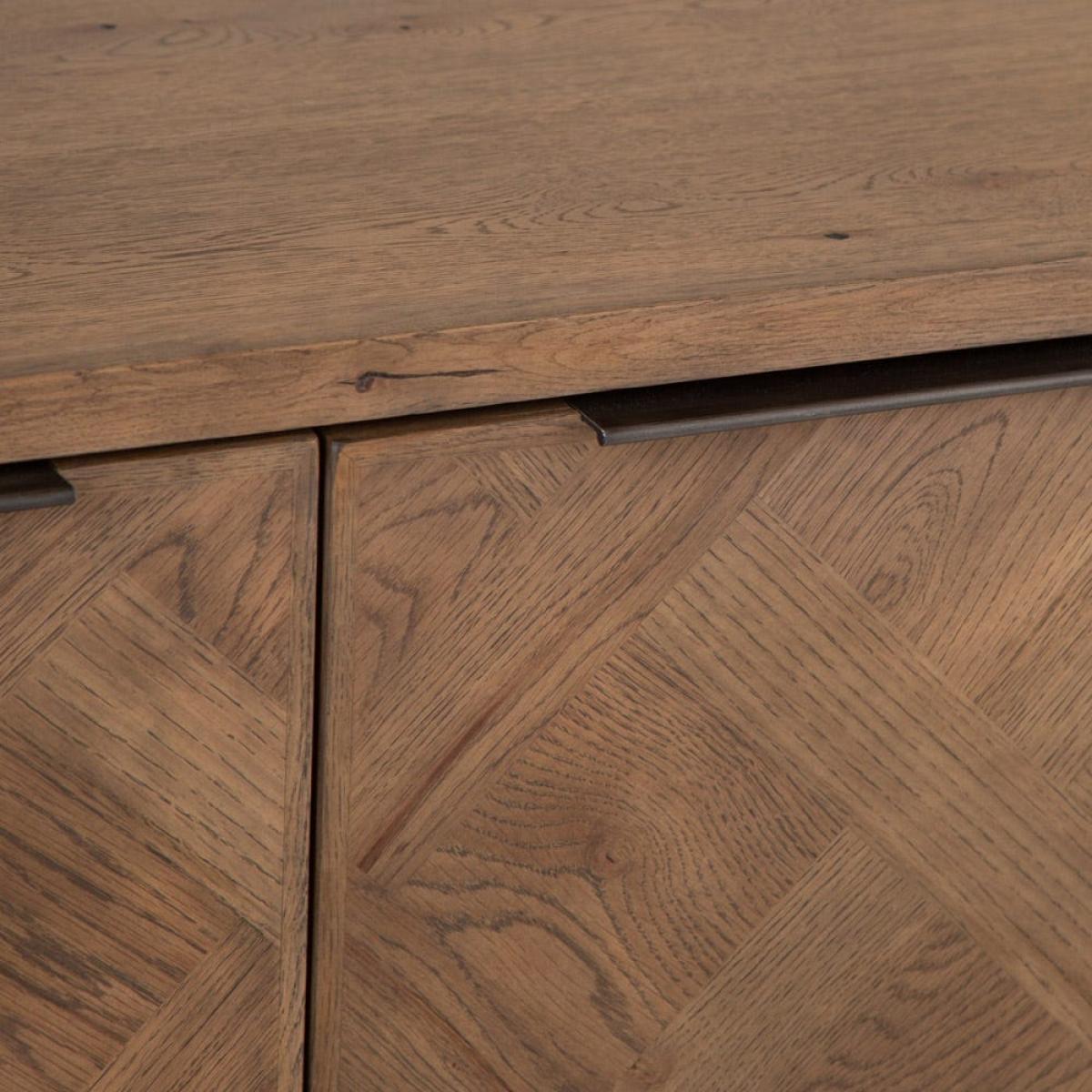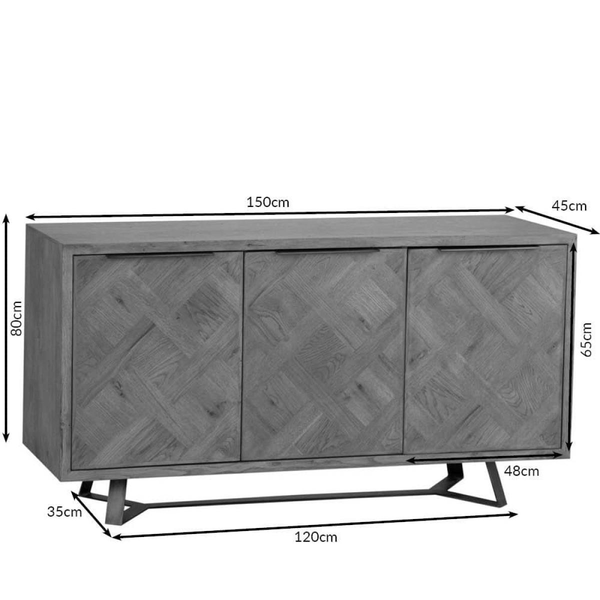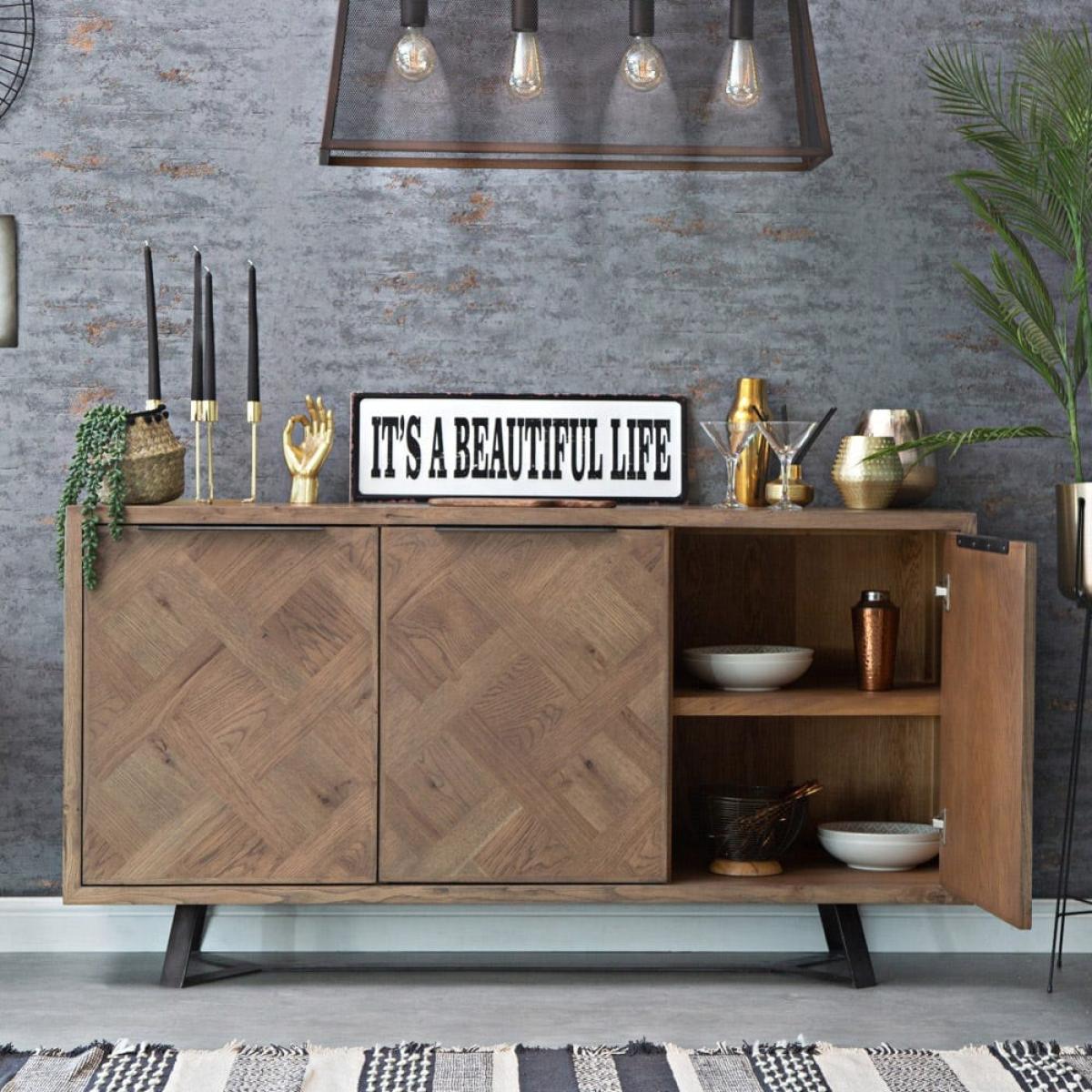 Our Industrial oak 3-door large sideboard makes a showstopping addition to any space. The oak and oak veneer composition features a basket-weave inlay on the cupboard doors, which have discreet gunmetal grip handles that let the wood finish shine. The angular legs add an appealing note of contrast. Each of the three spacious cupboards contains a pair of shelves, so there’s plenty of room for your very best wine glasses, champagne flutes and serving dishes. Dress up the top of this sideboard with framed prints, bright flowers or striking ornaments to turn it into the focal point of any space.