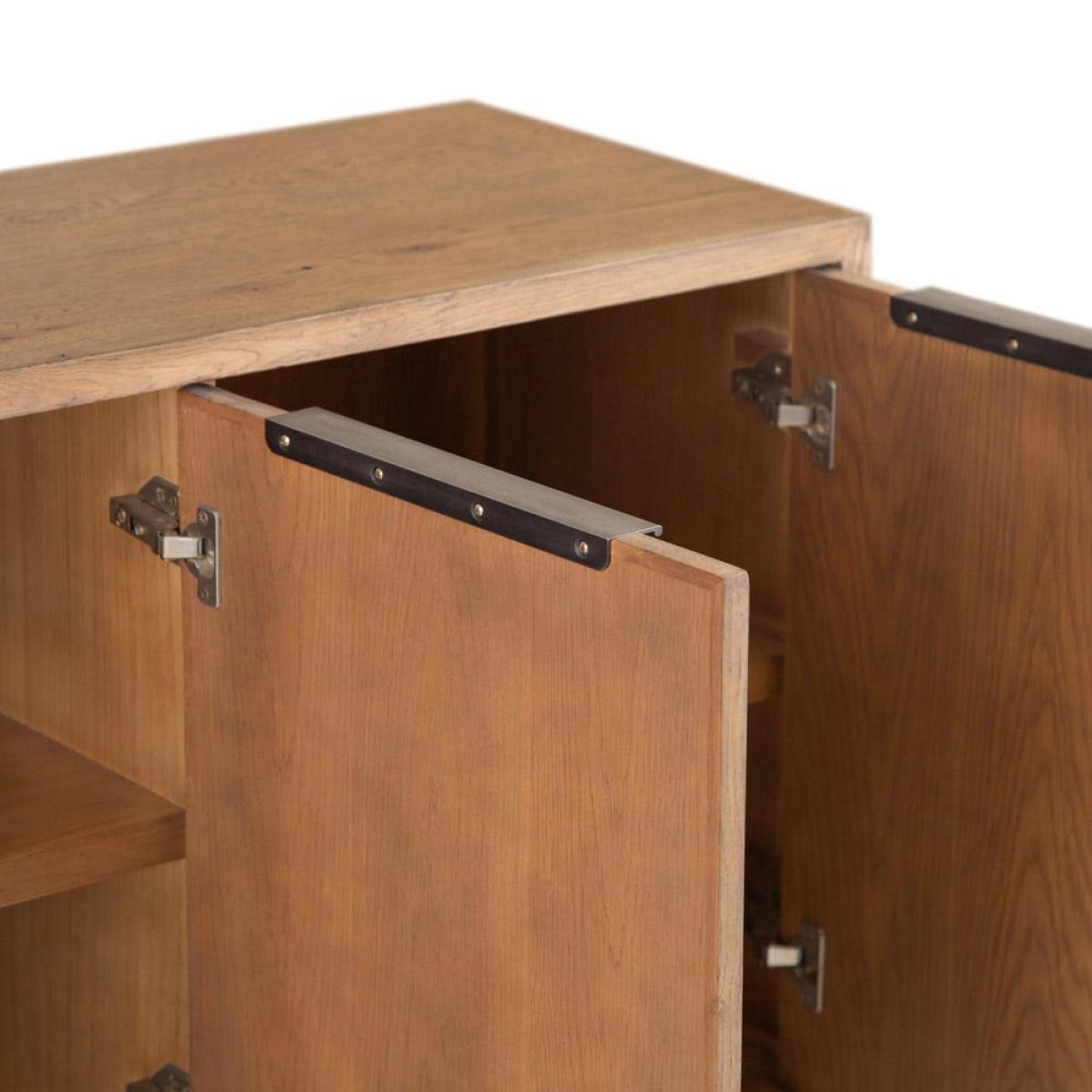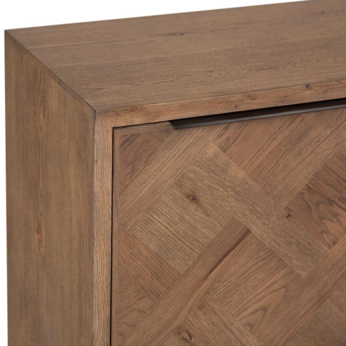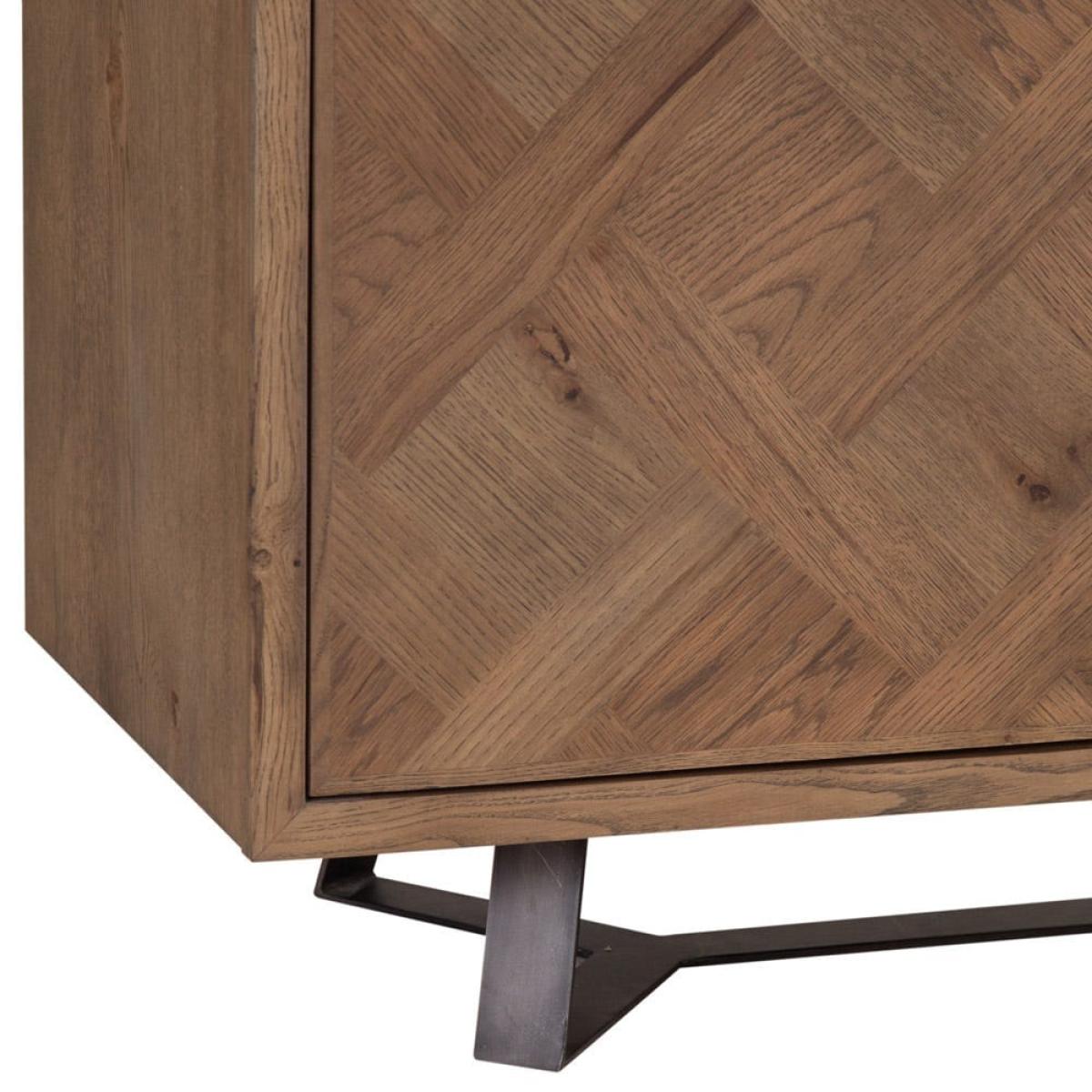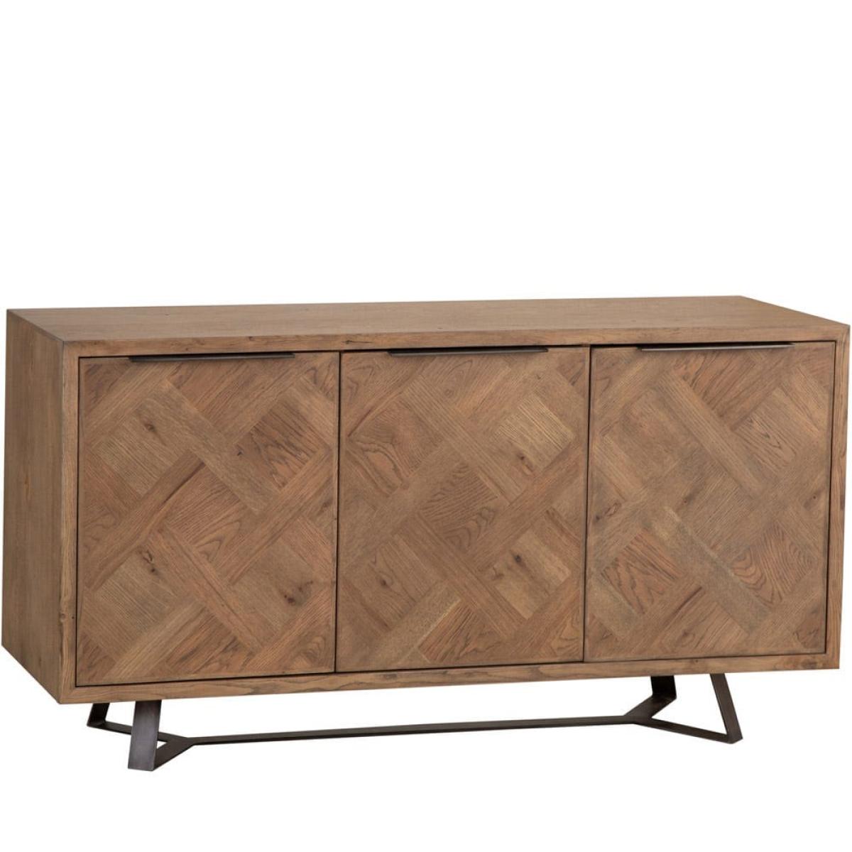Our Industrial oak 3-door large sideboard makes a showstopping addition to any space. The oak and oak veneer composition features a basket-weave inlay on the cupboard doors, which have discreet gunmetal grip handles that let the wood finish shine. The angular legs add an appealing note of contrast. Each of the three spacious cupboards contains a pair of shelves, so there’s plenty of room for your very best wine glasses, champagne flutes and serving dishes. Dress up the top of this sideboard with framed prints, bright flowers or striking ornaments to turn it into the focal point of any space.