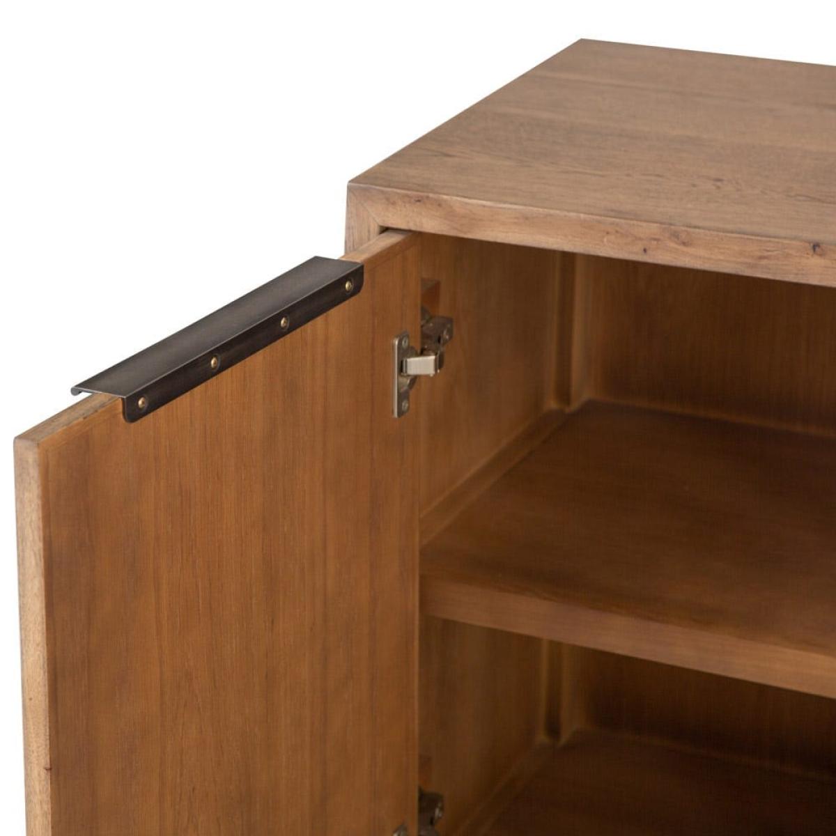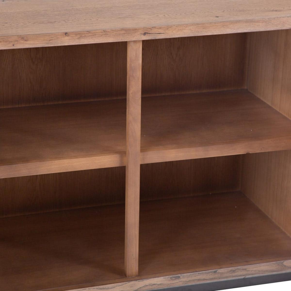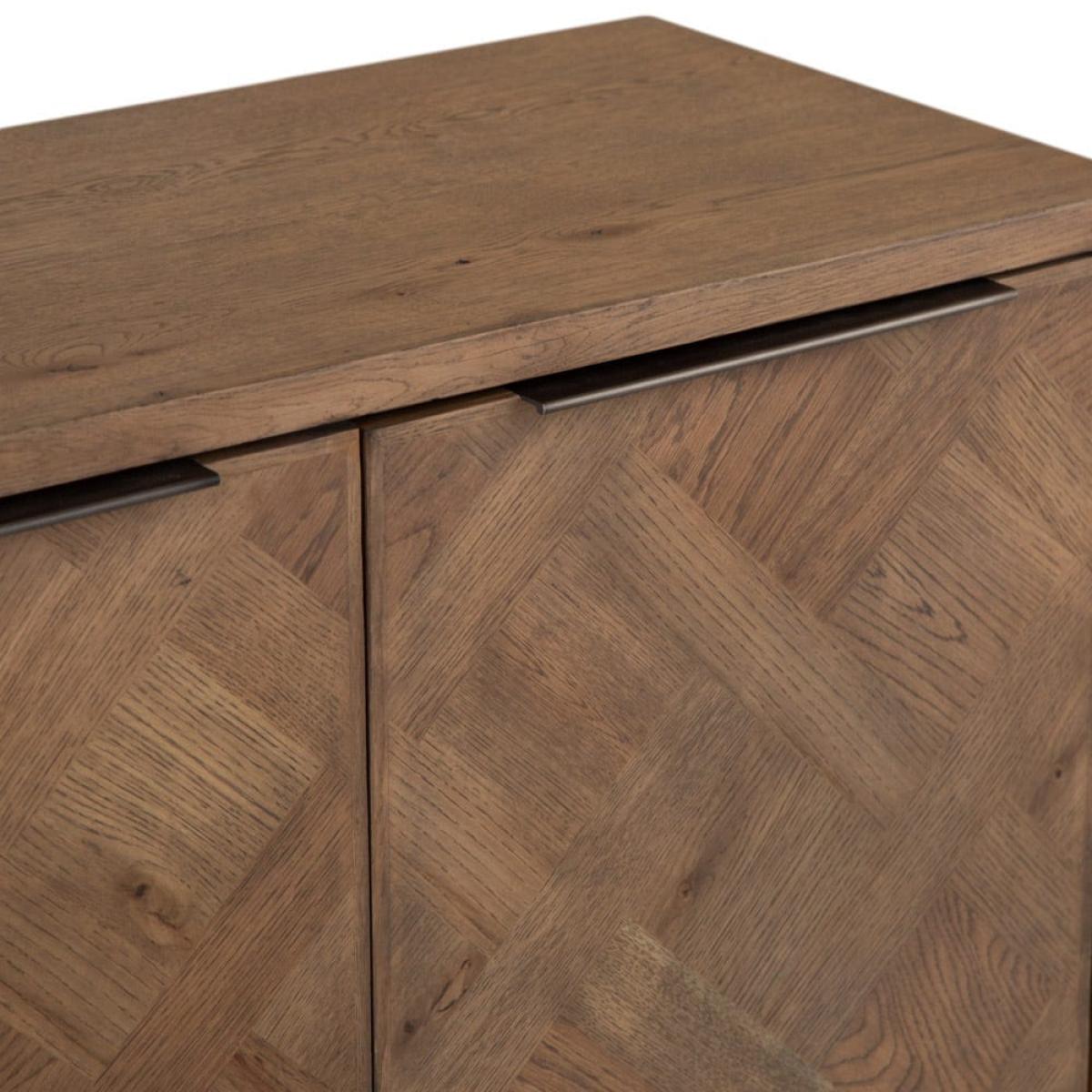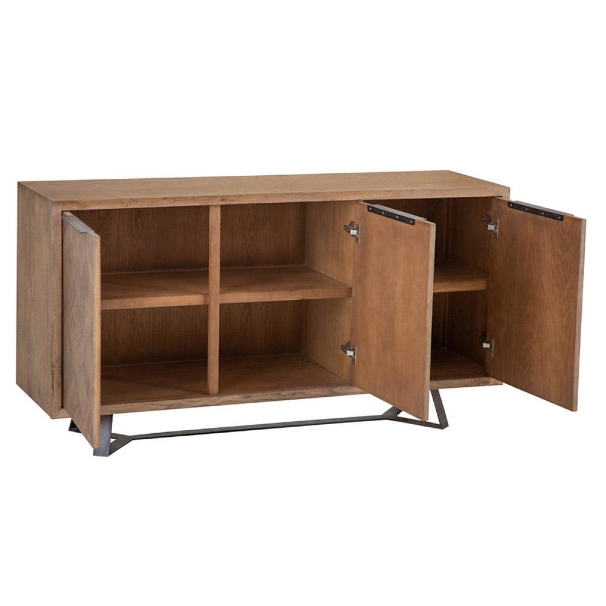 Our Industrial oak 3-door large sideboard makes a showstopping addition to any space. The oak and oak veneer composition features a basket-weave inlay on the cupboard doors, which have discreet gunmetal grip handles that let the wood finish shine. The angular legs add an appealing note of contrast. Each of the three spacious cupboards contains a pair of shelves, so there’s plenty of room for your very best wine glasses, champagne flutes and serving dishes. Dress up the top of this sideboard with framed prints, bright flowers or striking ornaments to turn it into the focal point of any space.