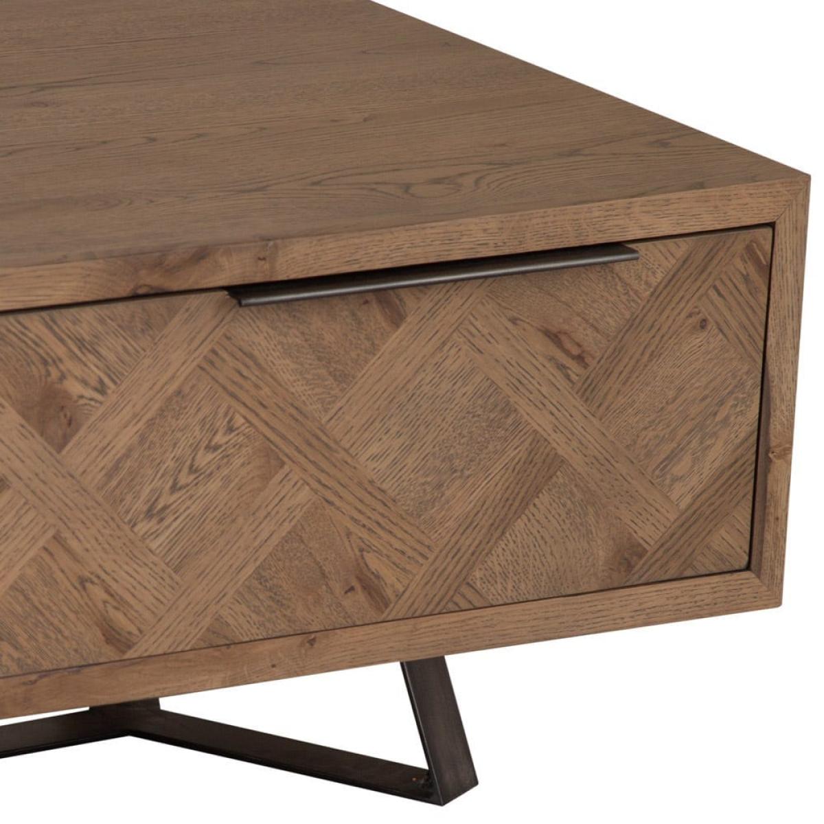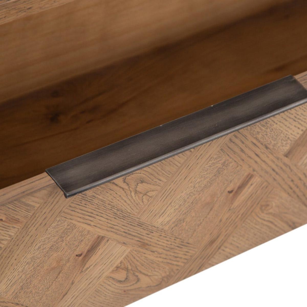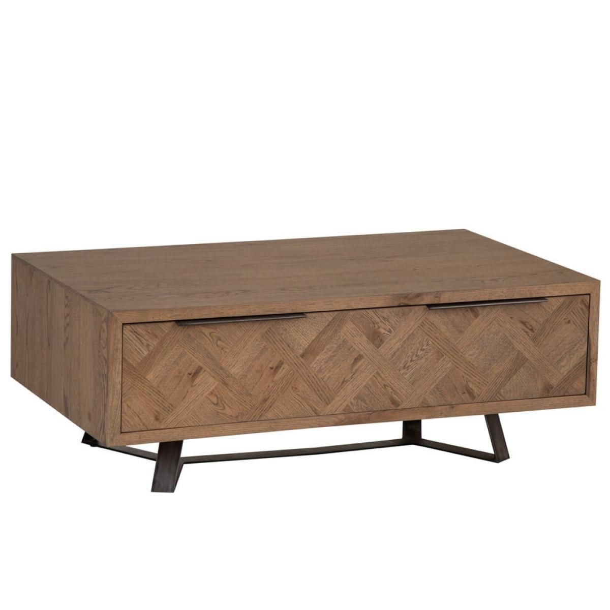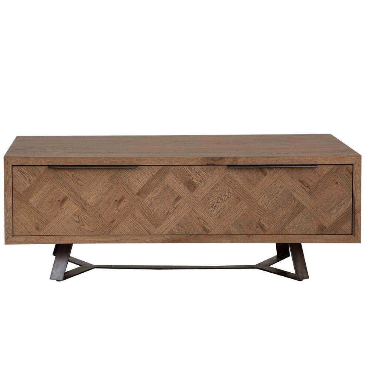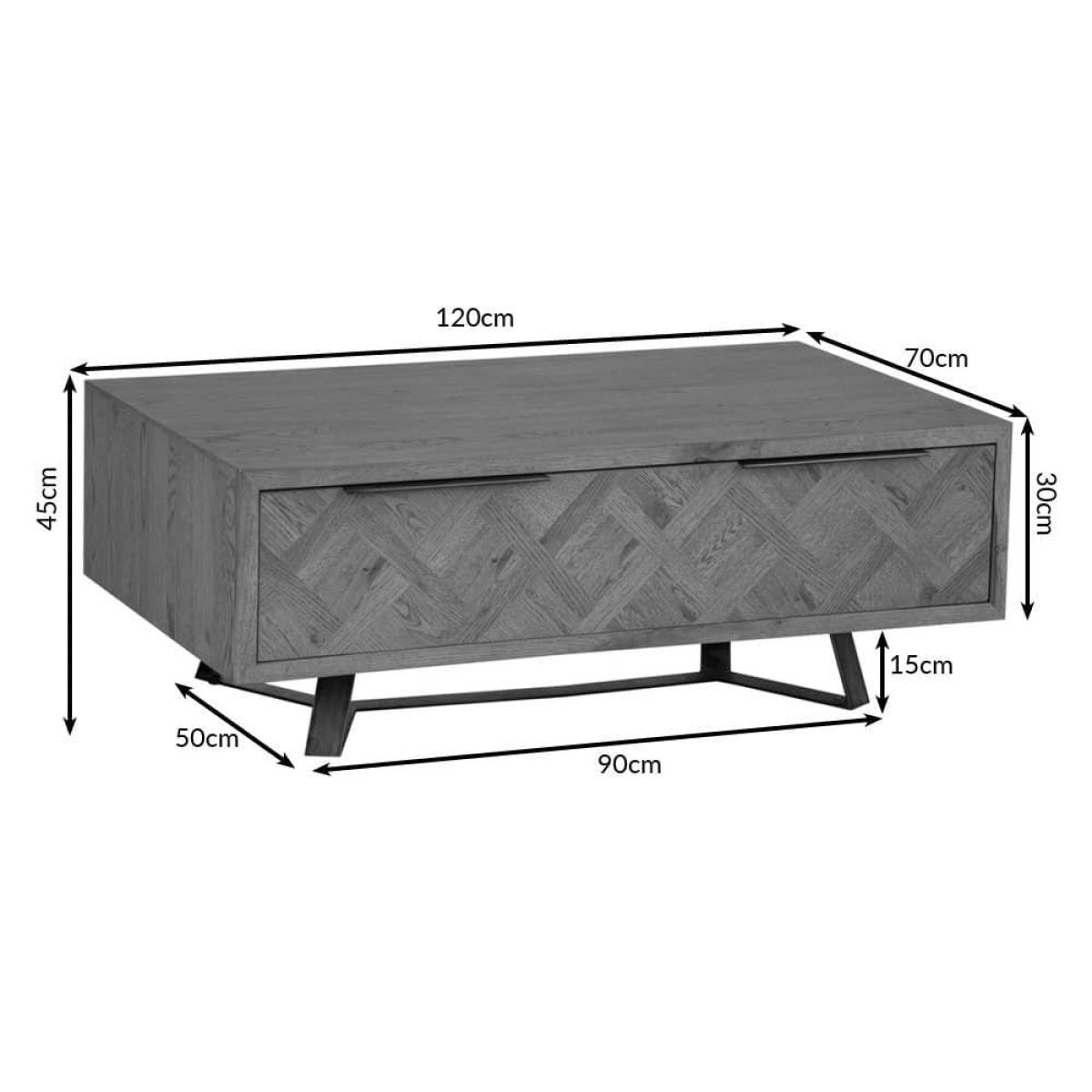 Turn your mid-morning break into a daily luxury with our Industrial oak coffee table. The richness of our oak composition is sure to rival your latte or Americano, and the angular metal legs, finished in black, add a modern contrast. This coffee table is a clever storage solution too – discreet grip handles open up a generous drawer, which is ideal for tidying away magazines, TV remotes or boardgames. It features a basket-weave inlay that adds a touch of geometric flair. Display your favourite reading material on the top or leave it clear to show off the gorgeous grain.