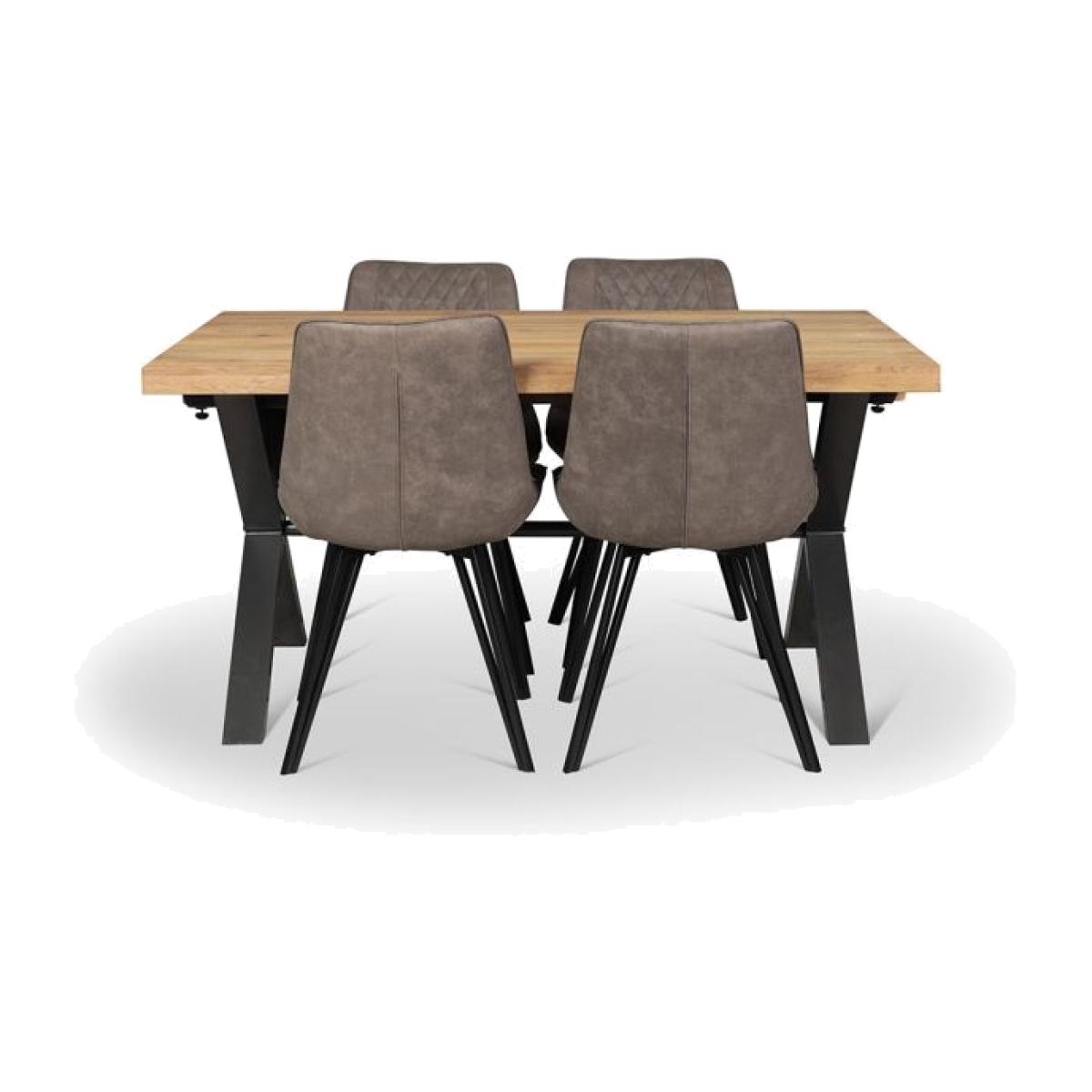 For modern industrial style look no further than our dining bundle containing our Industrial Dining Table and four Finnick Dining Chairs in light grey. The table has a robust natural wood top supported on stylish crossed matt back metal legs and is paired perfectly with four Finnick chairs. The chairs are amazingly comfortable with a deep seat and classic diamond stitched soft leather effect fabric. This dining set is perfect for any contemporary home with a rustic twist.