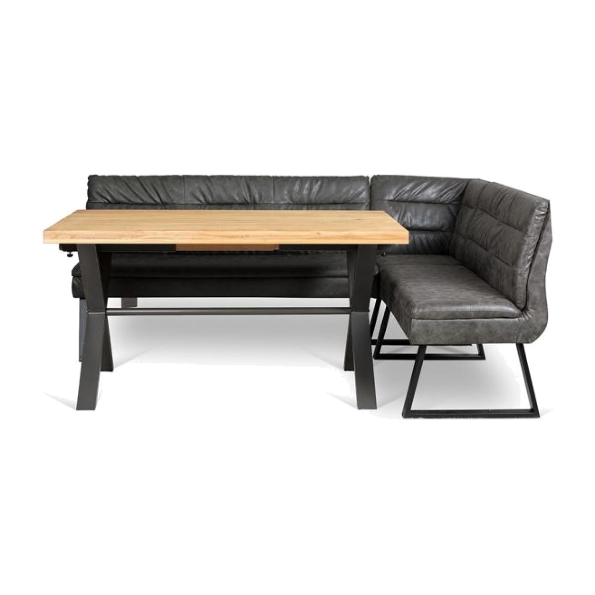 Get the ultimate industrial look with this dining bundle of our Industrial Dining Table, Industrial Corner Bench in grey. The table has a robust natural wood top supported on modern crossed matt back metal legs. The corner bench complements the set with its faux leather upholstery, deep cushioned seating and industrial black metal legs and creates a social seating space perfect for dining with family and friends.