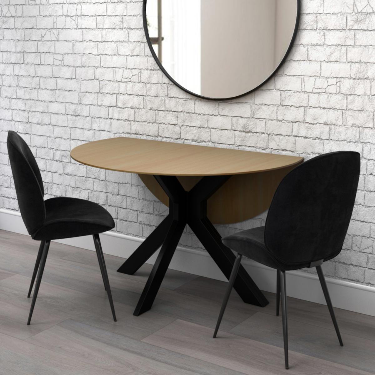 This Bundle Includes 1 x Carson Drop Leaf Dining Tables2 x Jenna Black Velvet Dining Chairs Dining Table Description Modern industrial round drop-leaf dining table. Featuring a beautifully crafted metal starburst frame. Folds when not in use so its ideal for smaller homes. Can fit up to four people around the table. The contrasting elements create a luxurious feel. Other size tables available in the Carson range. Dining Table Information. Dimensions. W100 x D100 x H75 cm Shape. Round drop-leaf table Colour. Natural Top Finish. Natural painted Base finish. Matte black powder-coated metal legs Material. Light oak veneer backed with MDF Base material. Metal Weight. 22kg Assembly required. Yes Dining Chair Description Luxurious velvet upholstery feels sumptuous. The elegant curved design creates a contemporary look. Contrasting black and solid black finish. Modern and on-trend the chairs stand out in any home. Available in a range of colours to suit your taste Dining Chair Information. Number of chairs. 2 Dimensions. H88 x W48.5 x D46.5 cm Seat height. 45.5cm Material. Velvet and; Metal Finish. Black velvet and; black metal legs Assembly required. Yes.