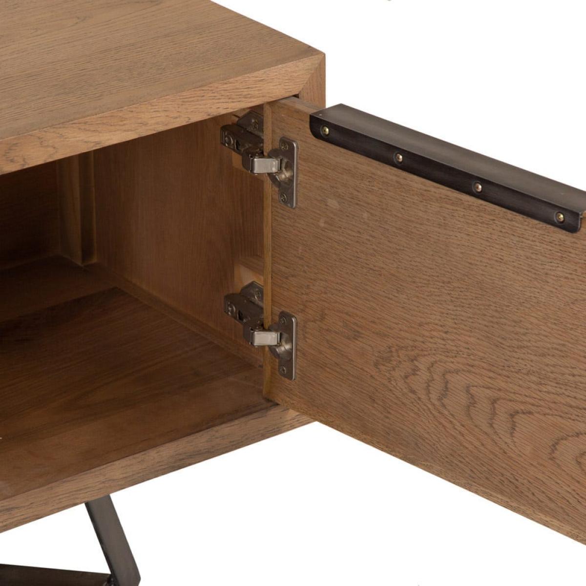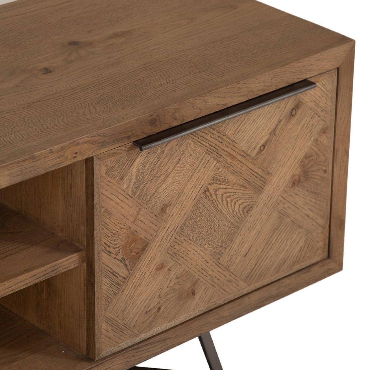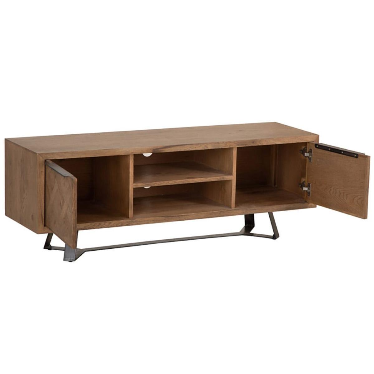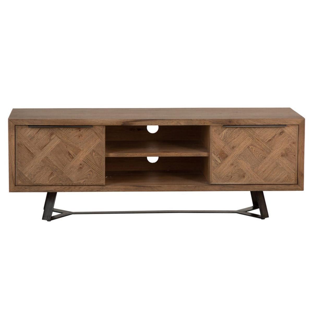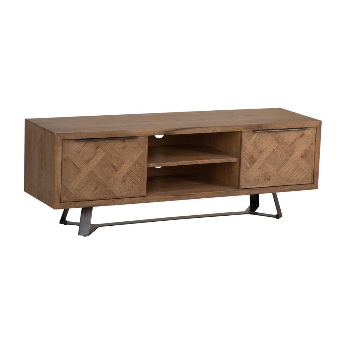 The industrial oak large TV unit is a versatile piece that works particularly well in contemporary or modern rustic interiors. I love its robust oak finish combined with the sleek black metal legs, which add an understated industrial edge. It provides ample storage with sliding doors and open shelving, making it practical for concealing remote controls and media accessories while showcasing decorative items. To style it effectively, layer it with minimal décor-think some curated picture frames, plants, or a statement statement vase-keeping the balance between function and aesthetic appeal. It pairs beautifully with neutral tones and textured fabrics, making it a practical yet stylish foundation for a relaxing living space.