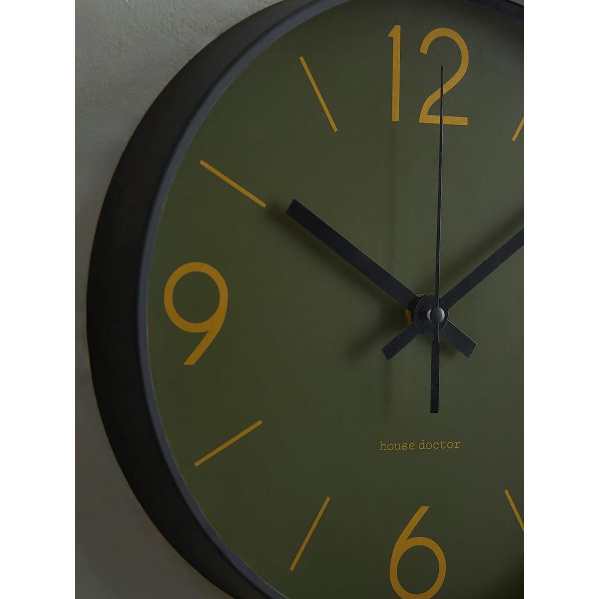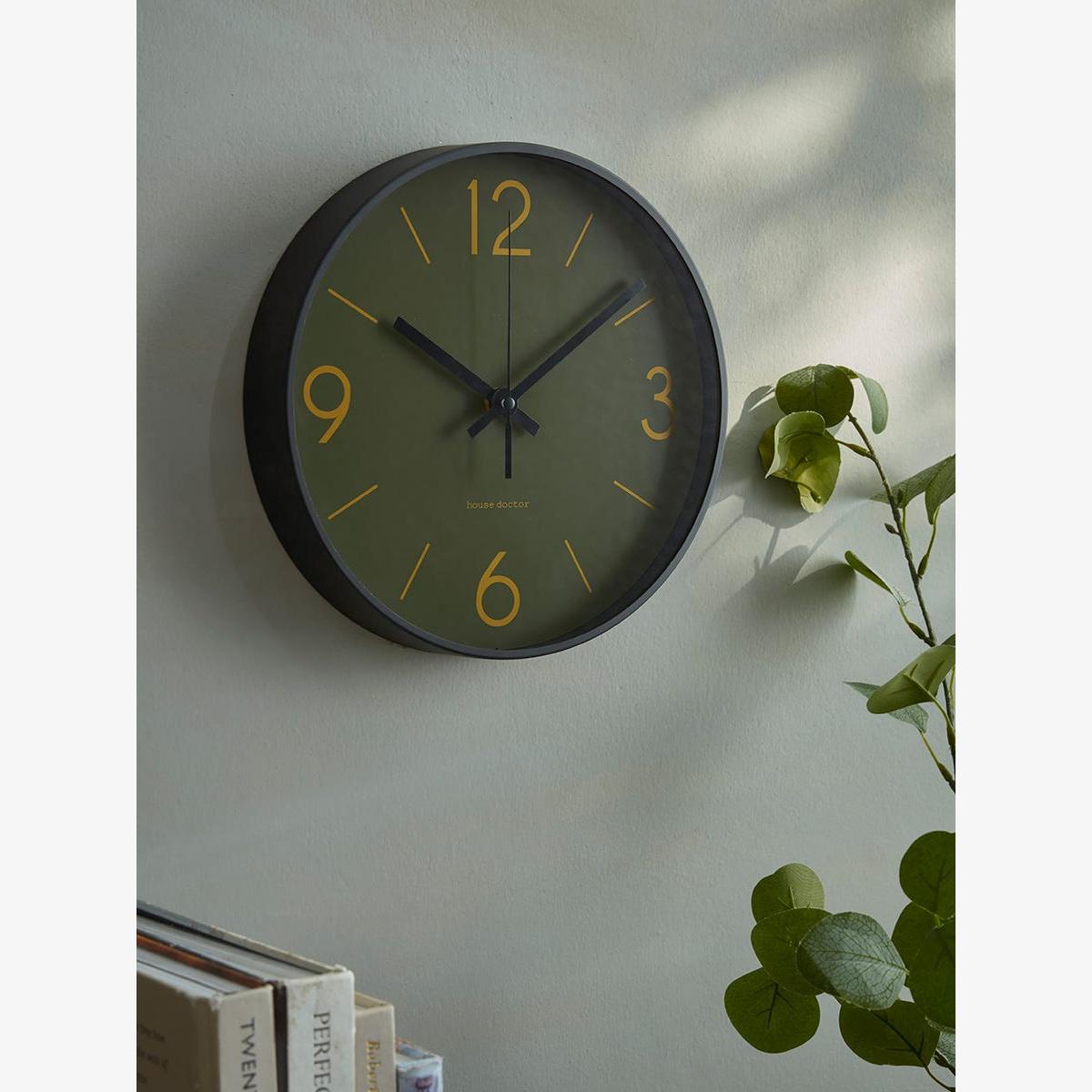 A striking black frame pairs with elegant gold numbers to create a wall clock that is relaxed and modern in style. The muted green background adds a gentle pop of colour to your space, whilst not being overpowering, allowing it to blend with a variety of interior schemes.