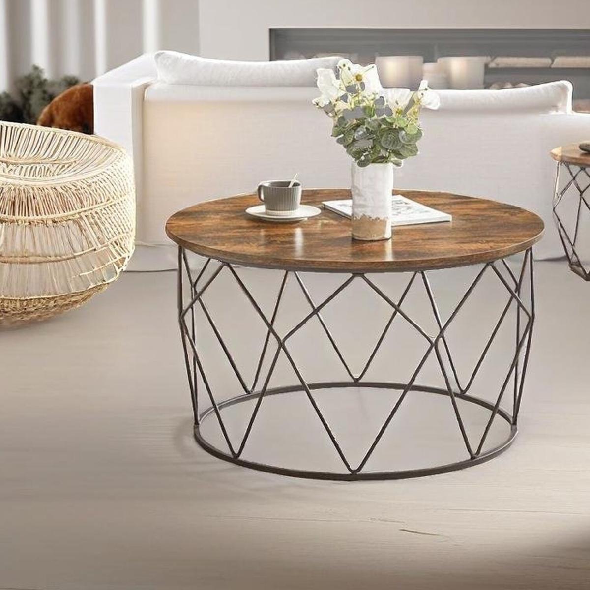 Industrial Round Coffee Table with Steel Frame - Brown