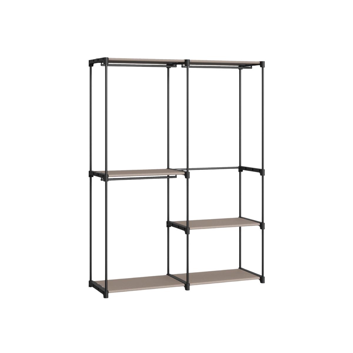 Features 3 hanging sections - 2 short and 1 tall (up to 132 cm) - to accommodate various clothing lengths. Additionally, 3 sturdy shelves provide space for bags, hats, socks, and other essentials, ensuring your belongings stay neatly organized. Made with robust metal tubes and quality plastic connectors, this wardrobe is built to last. Each fabric shelf supports up to 10 kg, while the hanging rods can hold up to 20 kg, offering reliable storage for your wardrobe needs. With its simple structure and neutral color, this portable wardrobe effortlessly complements any room decor, making it a perfect fit for bedrooms, living rooms, or entryways. No tools required - simply join the metal tubes with plastic connectors. Quick and straightforward assembly means your wardrobe will be ready in minutes.