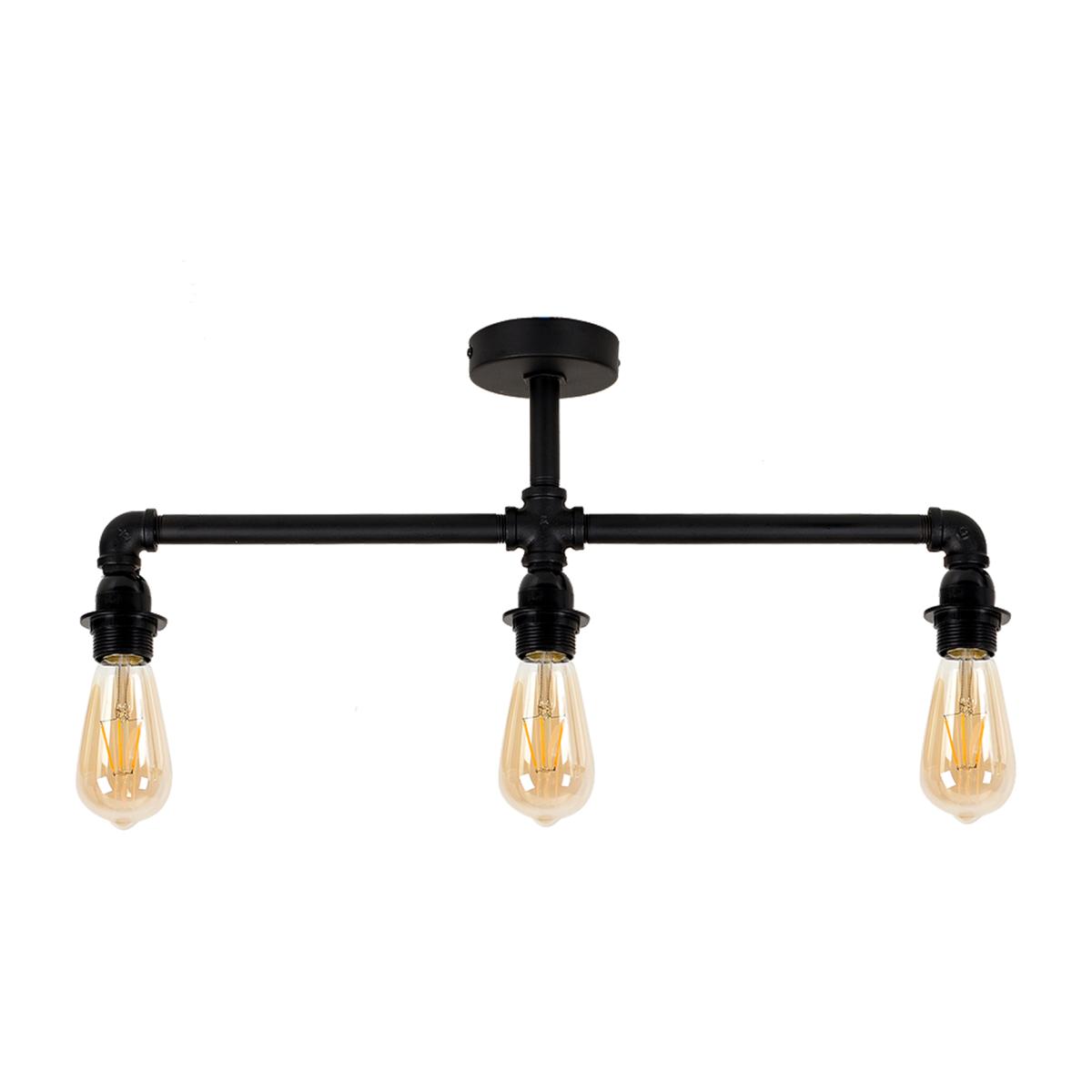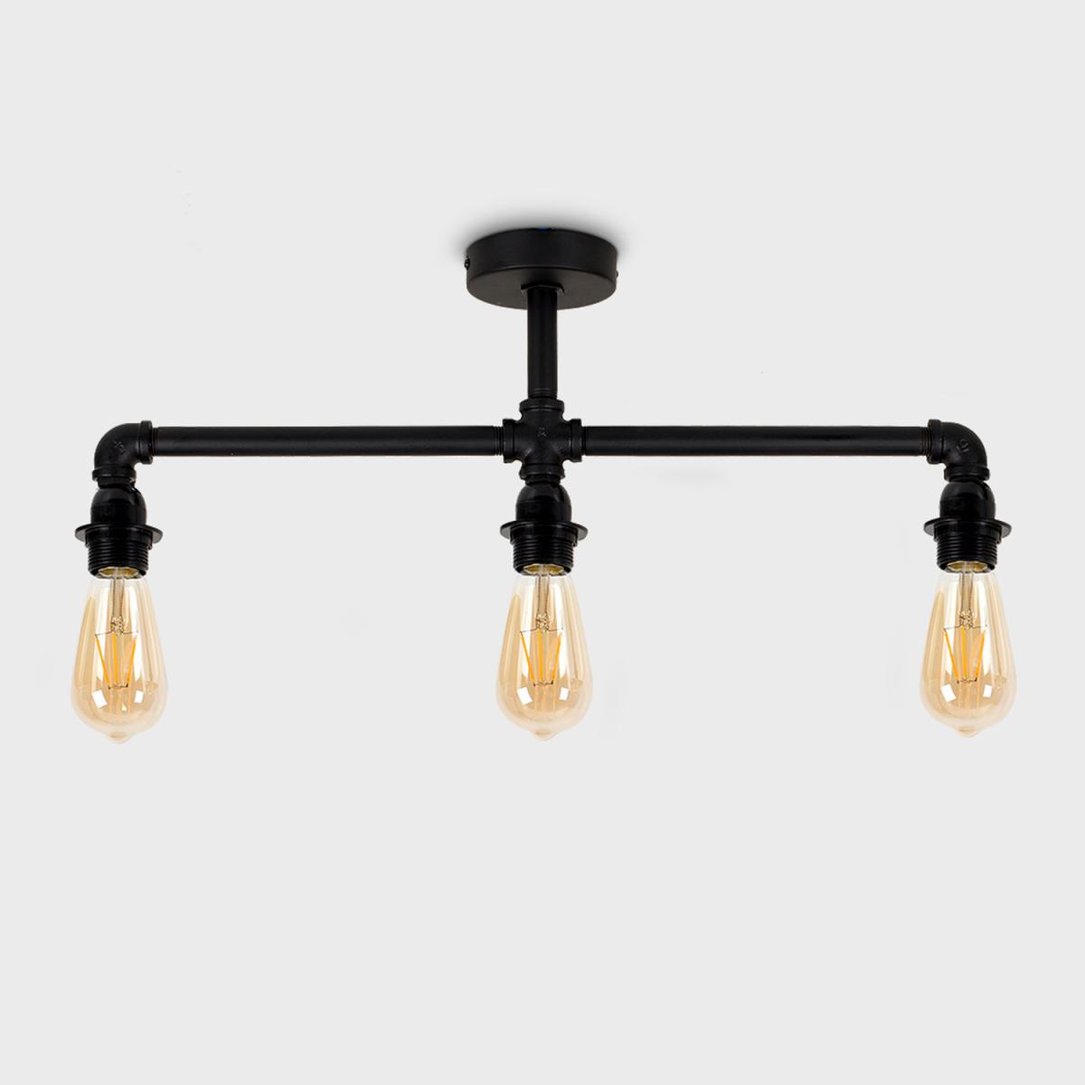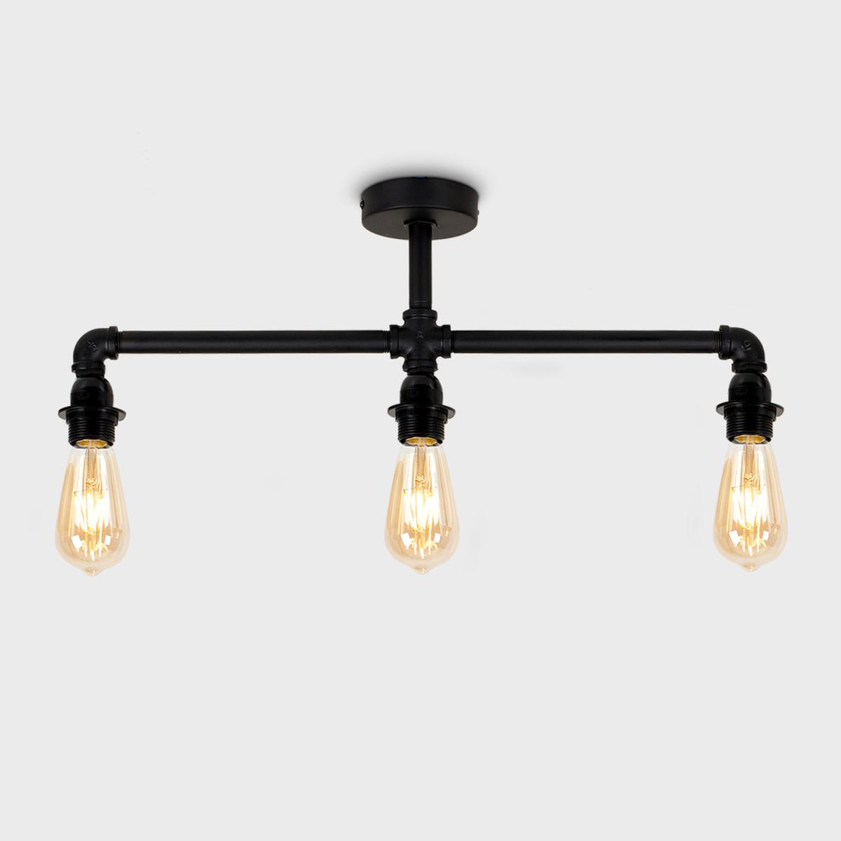 Vintage and industrial style 3 way pipework ceiling light fitting in a satin black metal finish. Ceiling lights are usually the main source of illuminating a room but with the many styles on offer today, also become a main focal point or talking point. This unique light will make a real style statement and complete your living space look. Ideal for dining rooms, kitchens and other living areas.