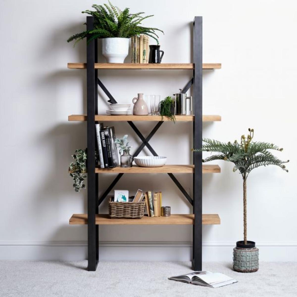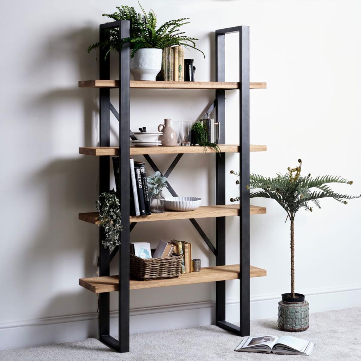 Use as a display shelf for ornaments, candles and family photos or as a place to keep books and music records. Featuring robust wooden shelves with a panelled effect making no 2 shelves the same, framed with a wide dark grey metal for an industrial finish. Team with the rest of the collection to complete the look.