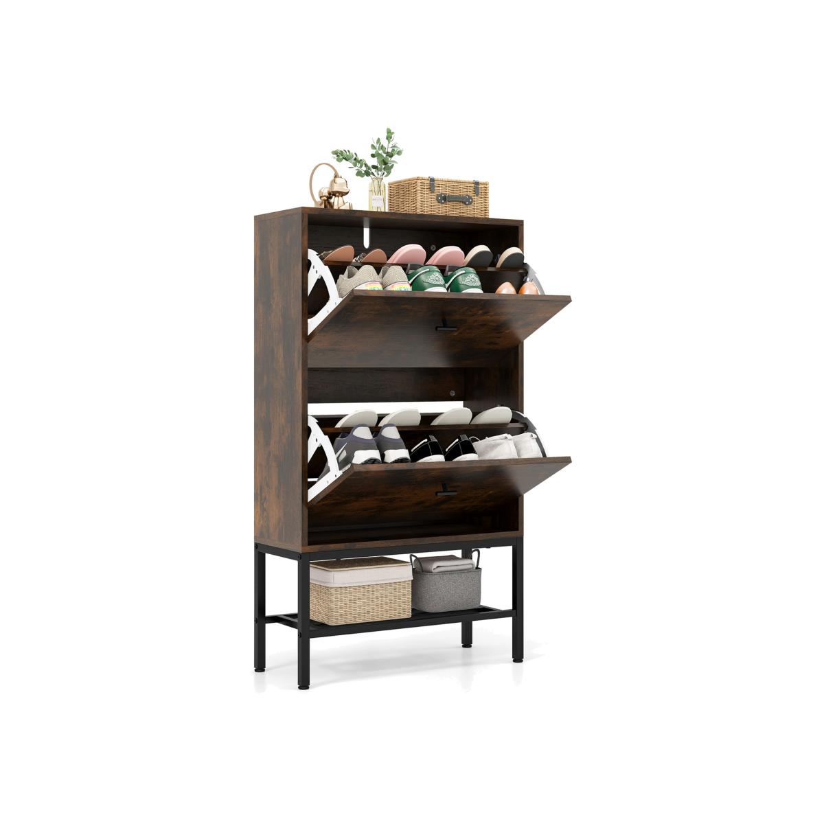 The flat top will be a nice place to store your keys, wallets, bags, or other items. 2 flip drawers with adjustable panels bring flexible shoe storage space. The panels can also be detached for more storage space. You can easily open and close the drawers with 2 handles. Besides, it's also equipped with a bottom metal shelf to place more shoes. This shoe cabinet can accommodate up to 15 pairs of shoes. Tips:The capacity depends on the style and size of shoes.