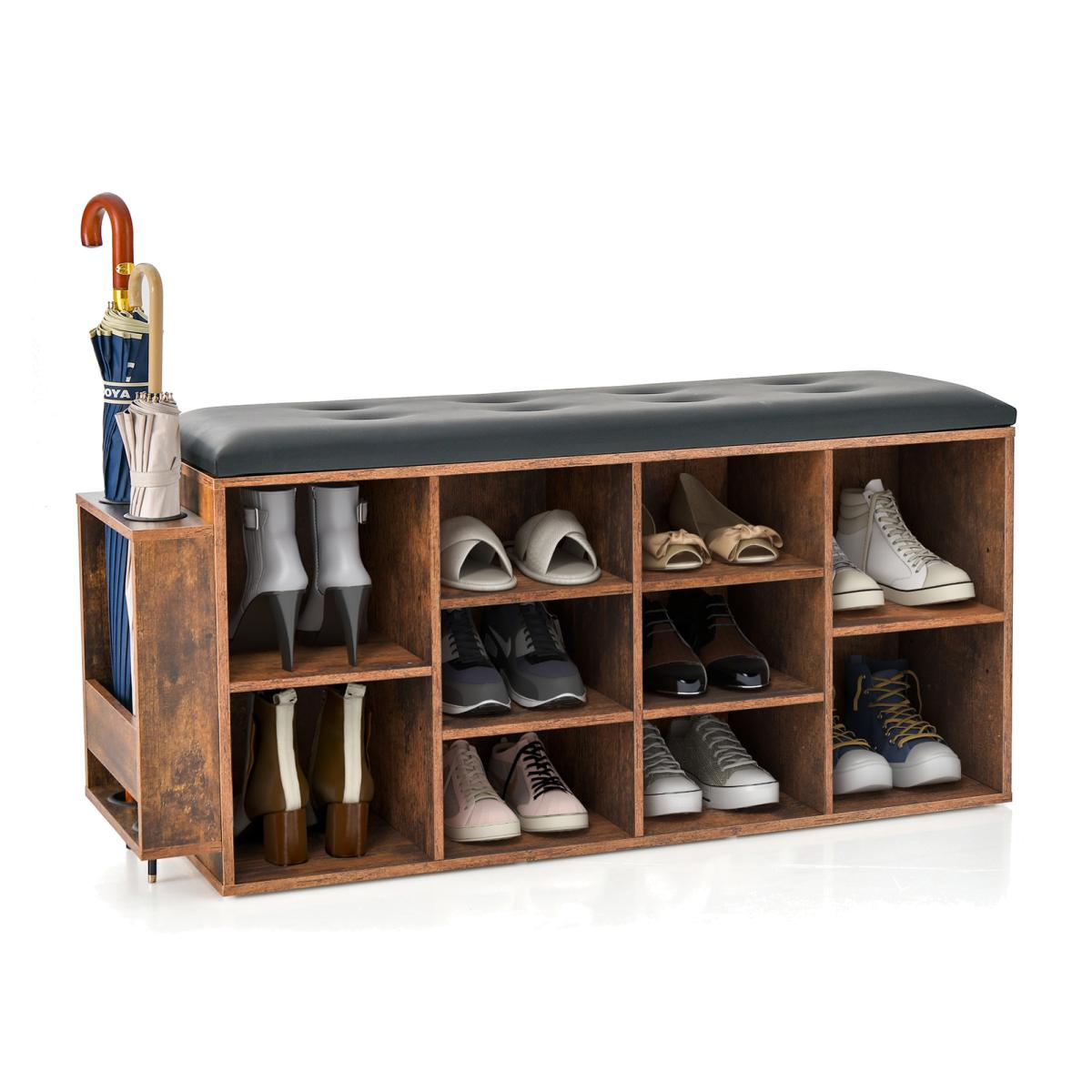 An ultimate solution for those seeking both style & functionality in their home: the shoe storage bench. It boasts 10 cubes, ensuring that your shoe collection is not only neatly organized but also easily accessible. Plus, it has 2 3-level adjustable shelves that offer a customized height to match different shoes. But that's not all! This remarkable bench also has a generous side umbrella stand, complete with double 6cm wide holes.