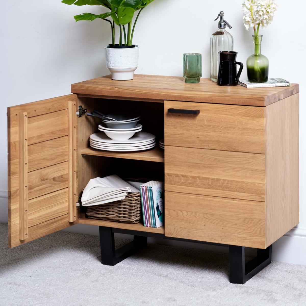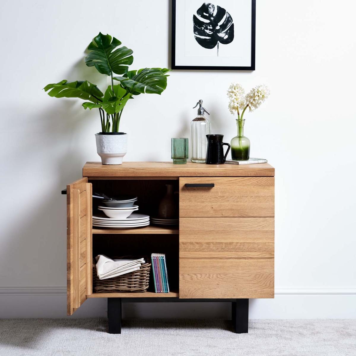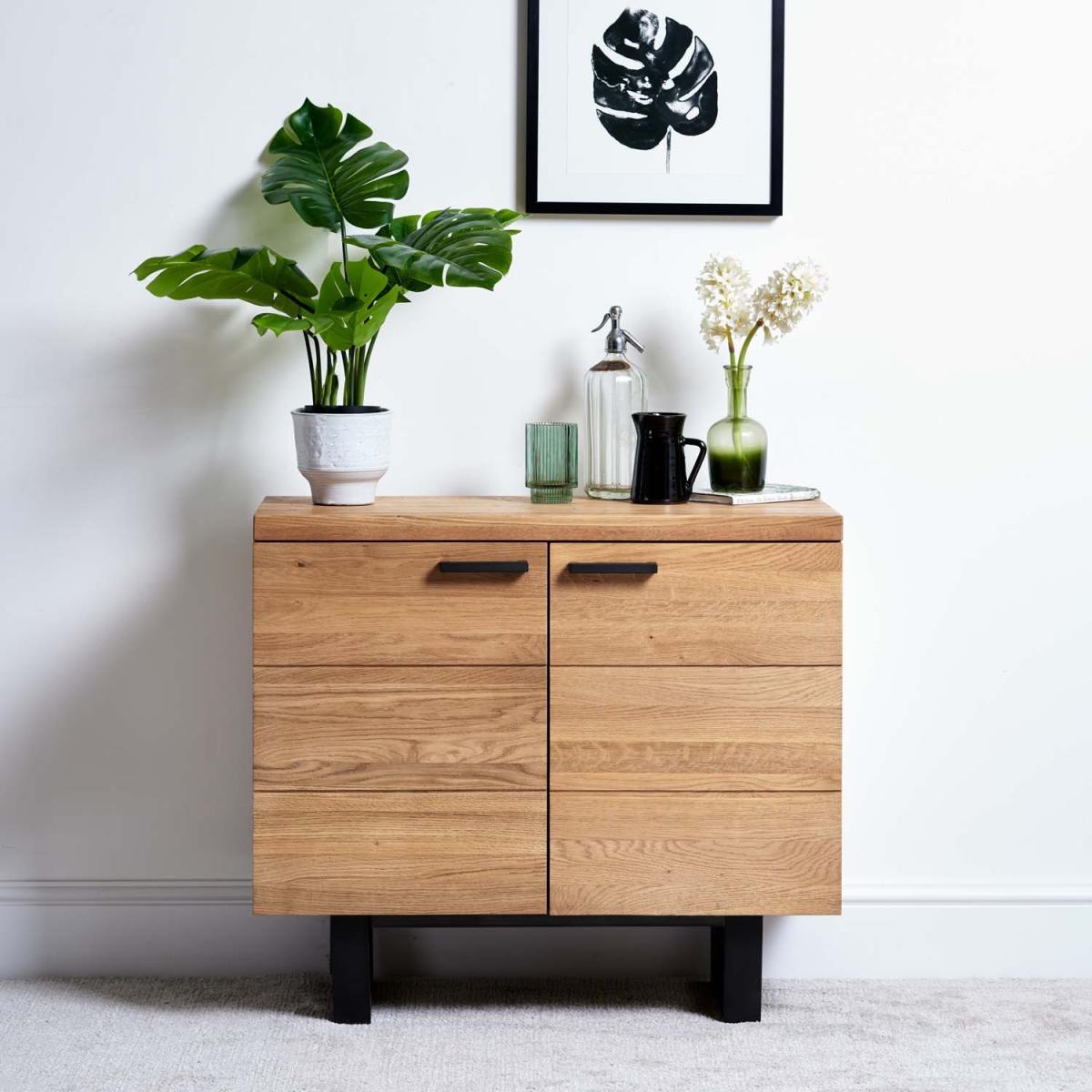 The perfect sized cupboard for those extra bits and pieces you want to keep stored away neatly. Admire the front of the sideboard doors that have panelled effect with different shades of wood all showing off their natural grain. The matching metal legs and door handles allow for easy opening. Also available in a larger size.