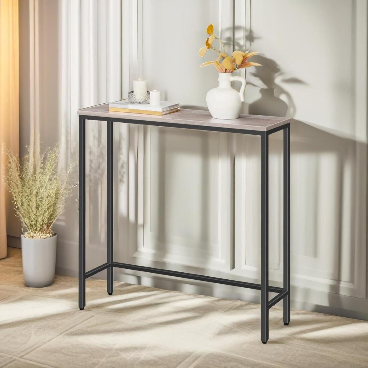 The console table, measuring 24. D x 75W x 75. H centimeters, is the perfect addition to your living spaces, whether it's placed behind your sofa, in the kitchen, study, meeting room, entryway, or hallway. Moreover, combining multiple console tables offers an even more generous storage solution. This sofa table serves multiple purposes. It can grace your entryway, holding keys, magazines, and a stylish hallway lamp, or it can find its place by the window, showcasing your beloved indoor plants. Additionally, it excels as a side table or end table in your living room when the need arises. The slender hallway table features a top constructed from high-quality particleboard, ensuring durability and prolonged use. Supported by a robust metal frame and four adjustable feet, this console table maintains stability on less than perfect flooring surfaces. The fusion of a black metal frame with rustic brown wooden panels complements various color schemes, enhancing the charm of your study or bedroom. Assembling this console table is a straightforward process. With detailed instructions and parts clearly numbered, you'll have it ready in no time at all.