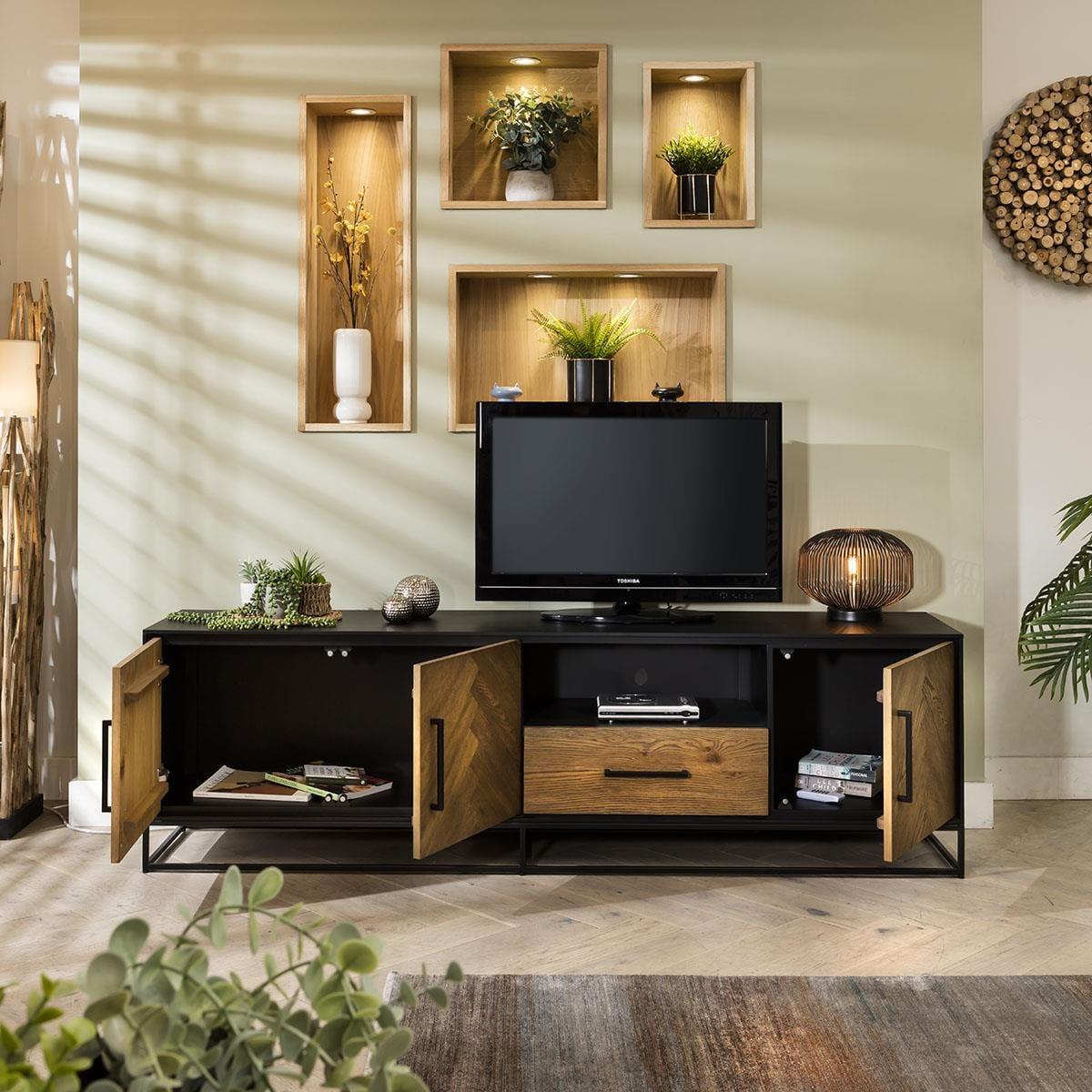 Crafted with solid wood and oak veneer, this modern TV stand boasts a parquet herringbone pattern on the cupboard doors, with a premium stain for a luxurious touch. The TV cabinet body flaunts a chic lacquered black finish, perfectly complemented by black metal handles, offering an industrial appeal to any living room. This TV stand doesn't compromise on space or style. Featuring a large double-door cupboard, a spacious open shelf, a drawer, and an additional single cupboard, it accommodates all your entertainment essentials. The unit's clever design provides ample storage while maintaining an open, airy feel. Plus, the 13cm black metal frame elevates the stand, adding an extra touch of sophistication. Worry less about assembly - this unit arrives preassembled, requiring only the attachment of the feet, ensuring a hassle-free setup. With its 200cm width, it easily accommodates even the largest televisions, becoming the focal point of your entertainment area. Whether you're showcasing your TV or organising media components, this TV cabinet combines functionality with a contemporary aesthetic. Curated to complement your contemporary lifestyle seamlessly, with plenty of storage - double-door cupboard internal dimensions W88cm D35cm H33cm, open-shelf internal dimensions W59cm D36cm H20cm, drawer internal dimensions W55cm D30cm H12cm, single door cupboard internal dimensions W40cm D35cm H33cm. W200cm D40cm H58cm Solid Oak and Acacia with Oak Veneer Preassembled - Simply attach the legs