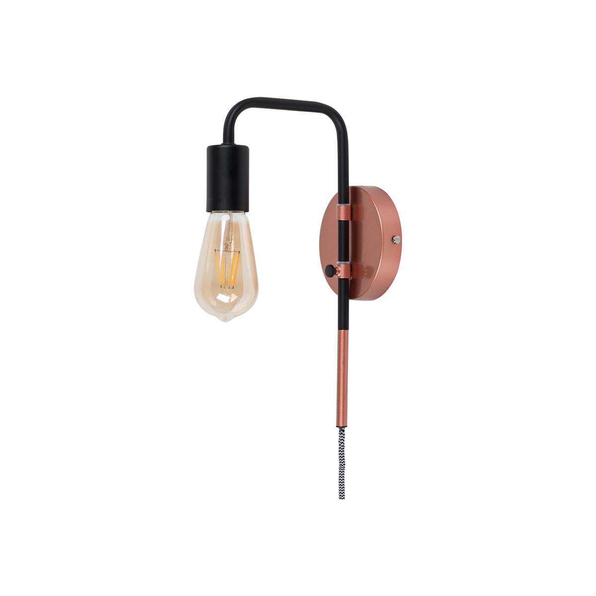 Vintage and industrial style pipework swing arm wall light fitting in a satin black and copper effect metal finish. Features an in-line onoff switch on a braided flex. This unique light can be paired with a filament light bulb which will make a real style statement and complete your living space look. Ideal for dining rooms, kitchens and other living areas.