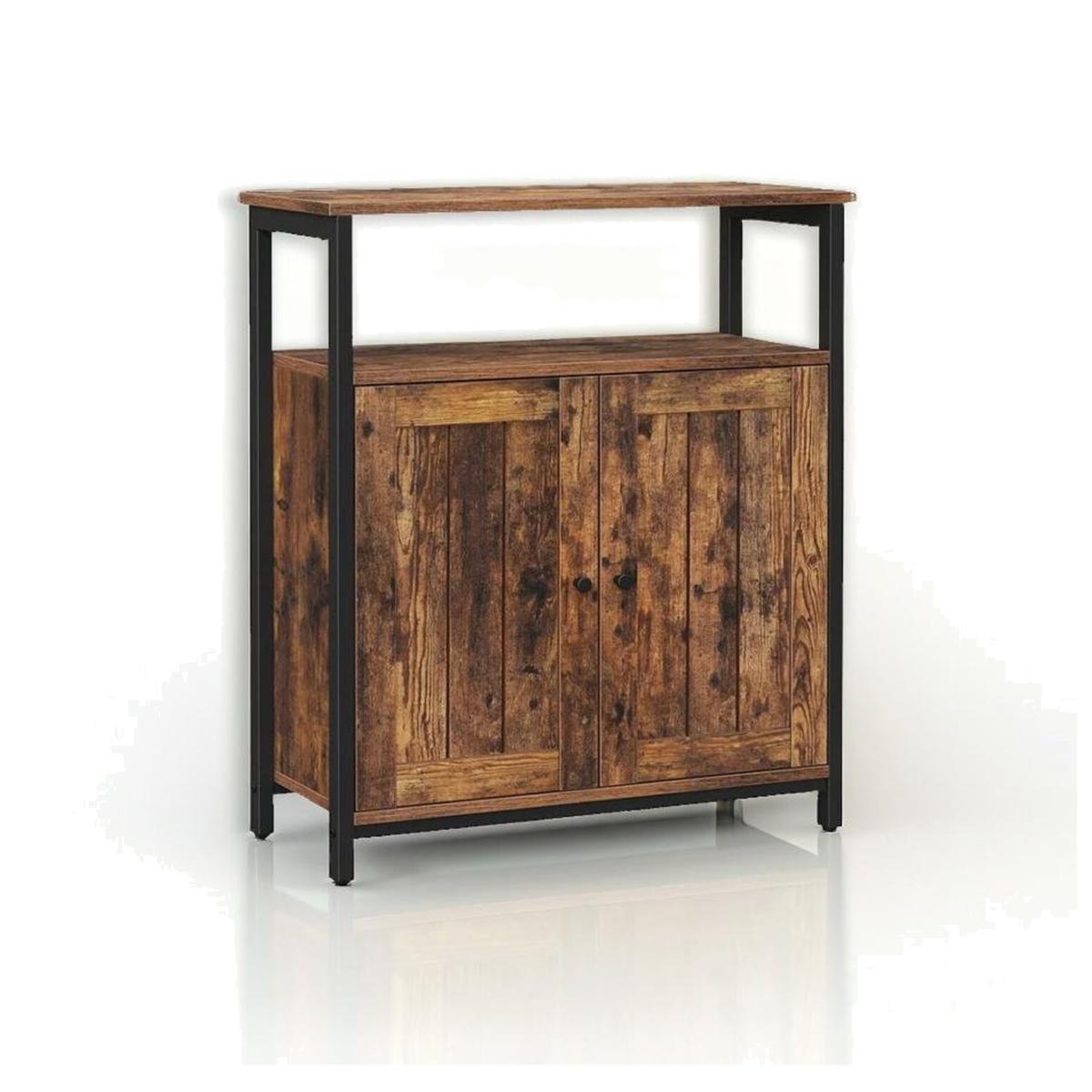 Enhance your living space with a touch of glamour using our industrial-style storage cabinet, featuring a sleek black steel frame and rustic brown particleboard. Perfect for the living room, hallway, or bedroom, it adds both style and functionality to your home. Create a sense of order with this versatile cabinet. Display flower vases, photos, or cherished trinkets on its top surface, keep newspapers or magazines organized on the open shelf, and neatly store daily essentials behind the slat door. It's a stylish solution for tidying up your living space. Stability is key, and this cabinet delivers. Crafted from durable particleboard and supported by sturdy steel frames with adjustable feet, it stands firm, ready to serve you reliably for years to come.
