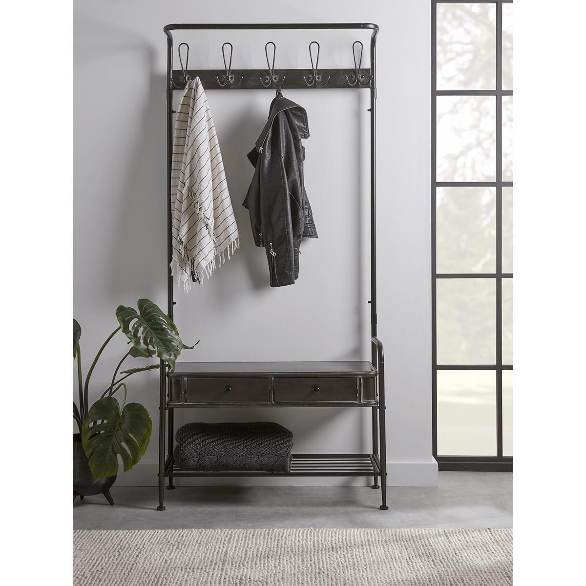 Crafted from iron with a beautiful rich finish and a touch of age to the details to communicate the industrial, functional tone, our coat rack has statement style. Features include a handsome row of five hooks, two generous drawers, and a lower luggage shelf. A perfect way to manage coats and scarves in the entrance hall or to furnish a guest bedroom.