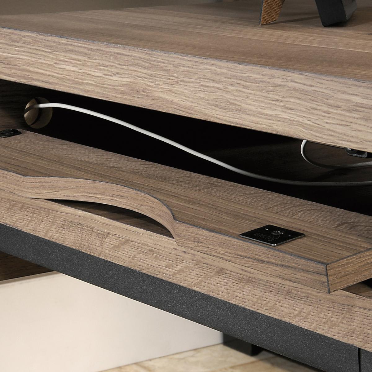 Dimensions H77.1 x W154.2 x D59.6 cm Features. Home office L-shaped desk in Salt Oak finish. Durable black steel frame for durability. Large desk and return provides a generous working area Drawer features full extension slides. Elevated shelf with cubbyhole storage. Cord management. Concealed storage with flip-down panel. Open storage with fixed shelf Assembly Required..