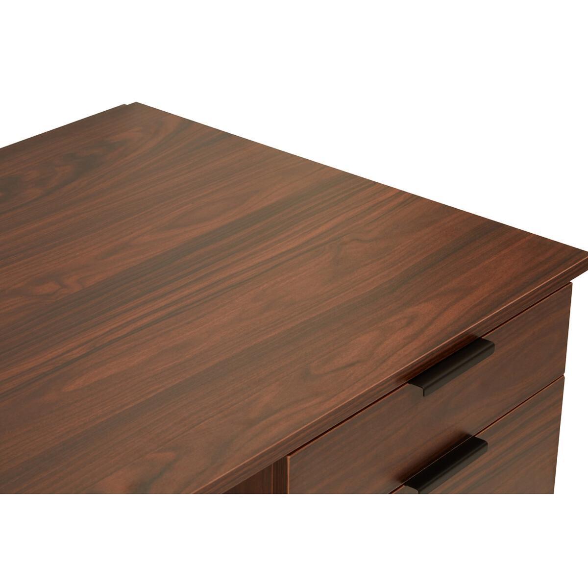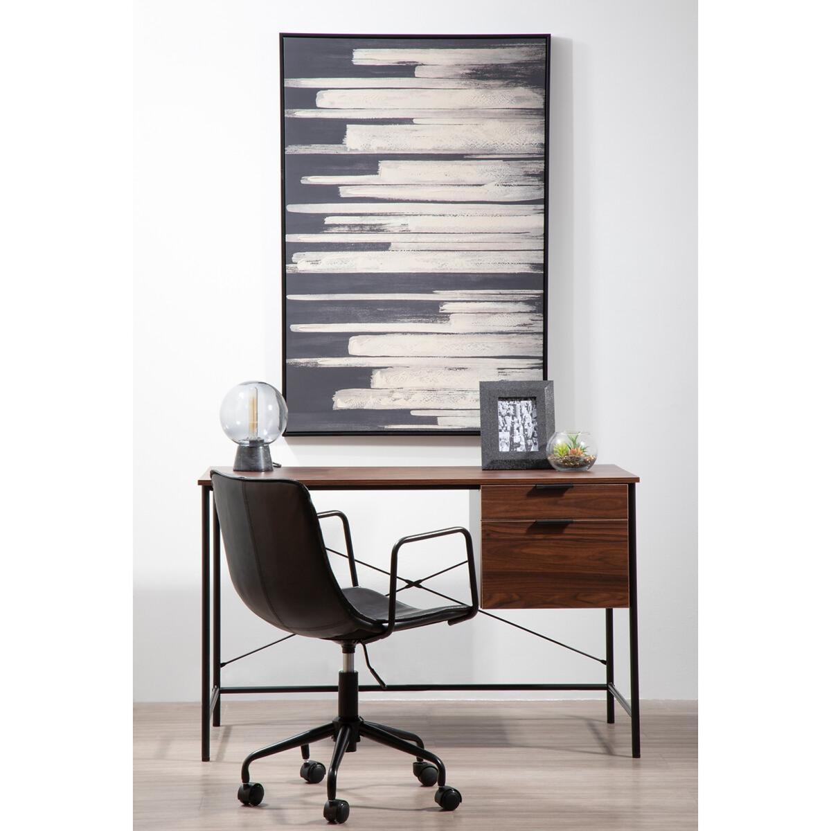 I’m a fan of this dark walnut desk for its clean lines and sturdy metal frame - it slots effortlessly into industrial, Scandi-industrial or even modern farmhouse schemes. The rich wood-effect top adds warmth against the black metal legs, while the two drawers give just enough hidden storage without overwhelming a small space. To style, keep the desktop uncluttered: a sleek metal task lamp, a slim notebook or two and a small plant look sharp without fighting the minimalist feel. Use matching black or walnut-tone accessories - a mesh tray, pen pot or cable organiser - to tie everything together and make the workspace feel both practical and pulled-together.