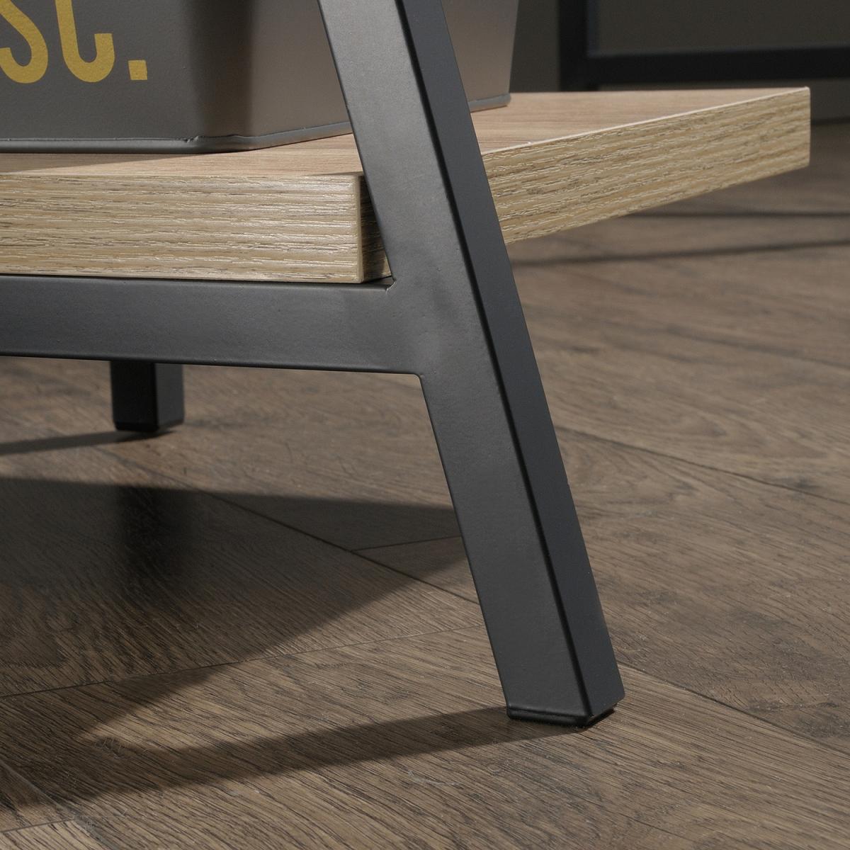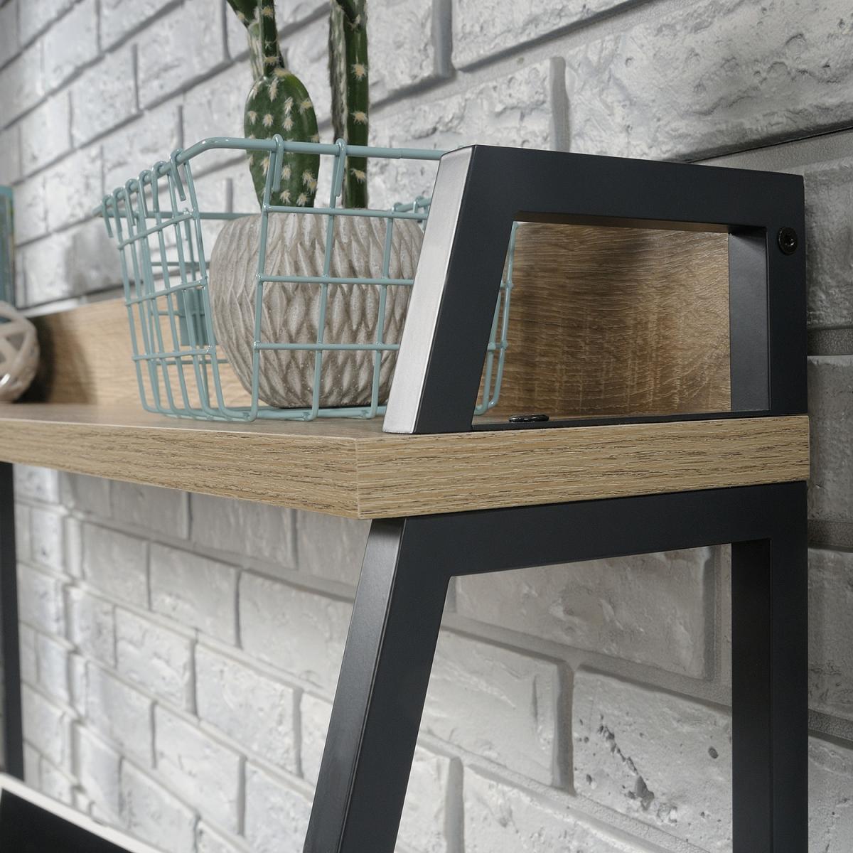 Teknik Office Industrial Style Bench features a durable black metal frame and charter oak effect desktop with 2 matching storage shelves and an upper shelf for plenty of open storage options.