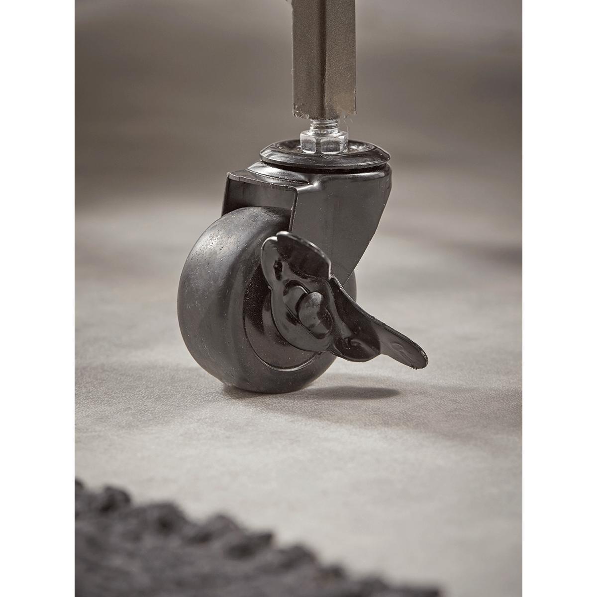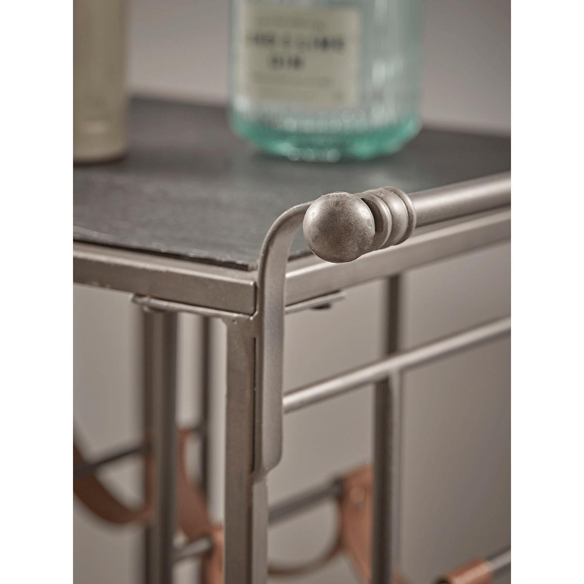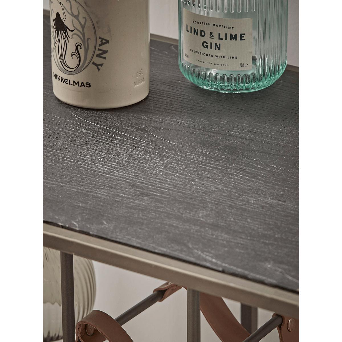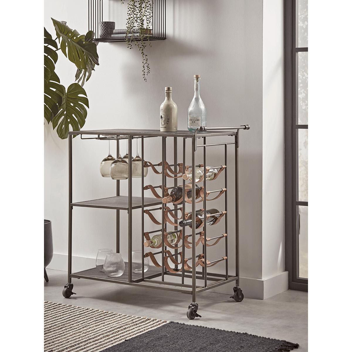 Crafted from iron with black-toned wooden shelves and a feature leather sling bottle rack our bottle trolley uses hardworking material to striking effect. Bring a gentle industrial look to your entertaining space here with style - the two deep shelves, integral stemware rack for glasses and a wine rack for up to 18 bottles, it will serve you well for years to come!. Each trolley features four caster feet and a trolley handle for mobility.