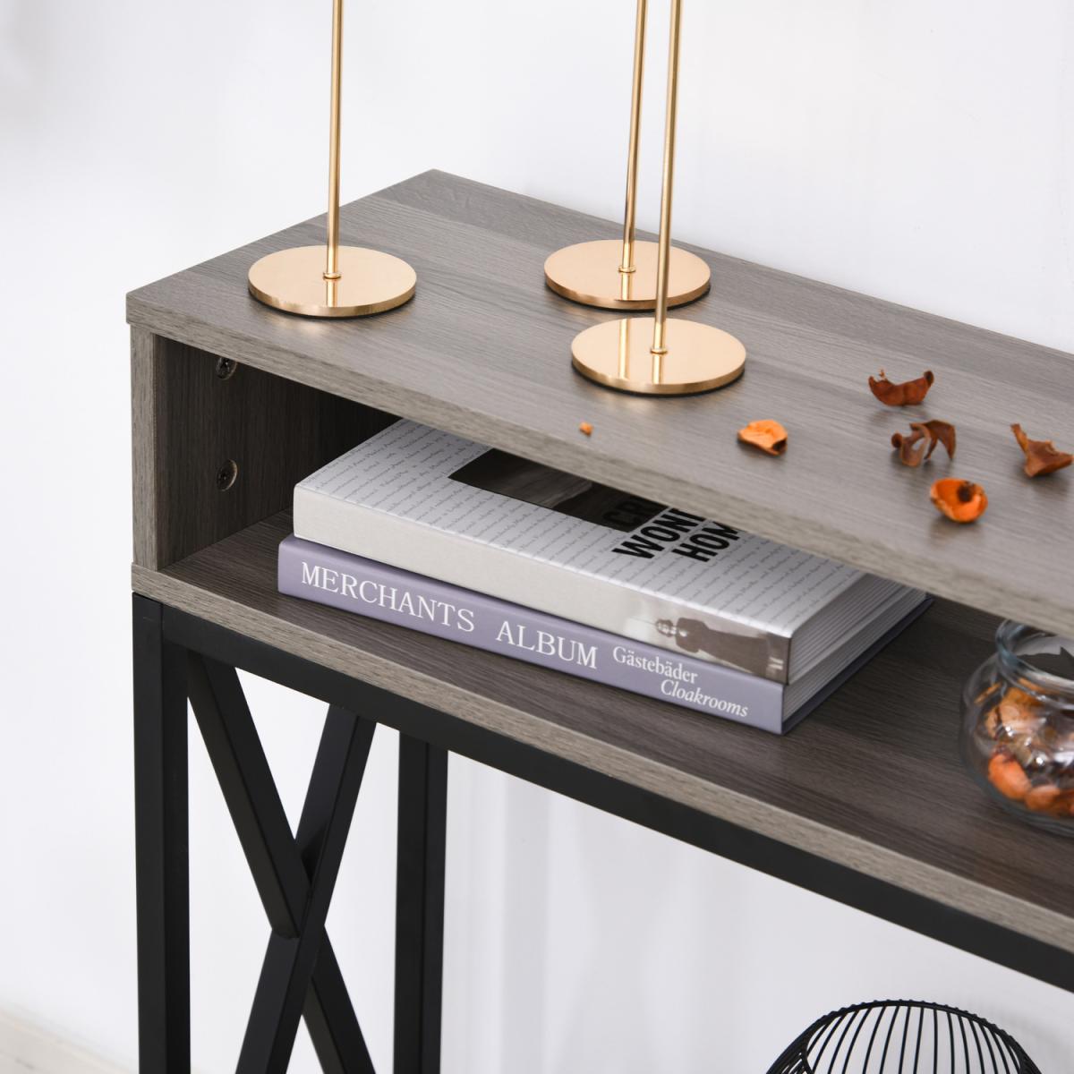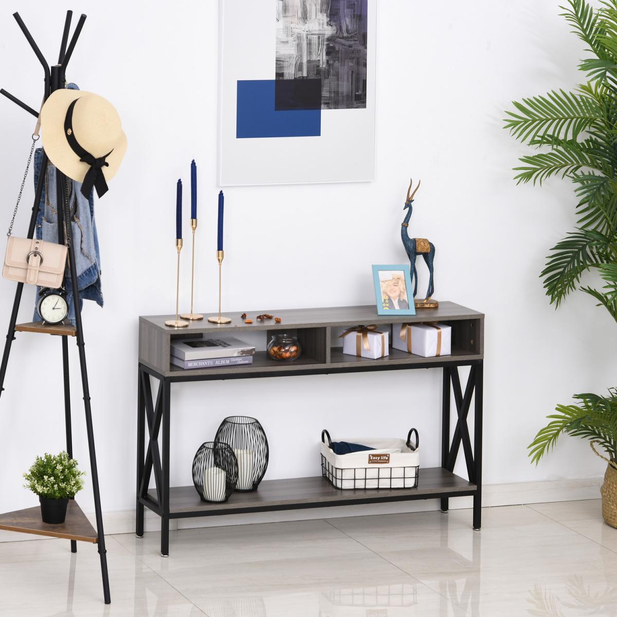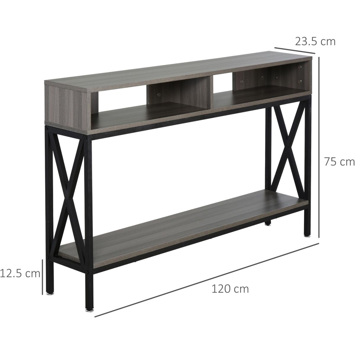 Bring a fresh feel into your home with this console table from HOMCOM. Using metal for the outer structure, it's made into a space-utilising design, where two small compartments are placed on the top, and a larger compartment is on the bottom - giving you plenty of room for storage and display. The shelves are made from particleboard in a thick finish for solid sturdiness, in a beautiful wood grain effect for a realistic look. Smooth in texture, it can be wiped clean for quick cleaning, with adjustable feet to ensure stability. A clean-cut design made to improve your home in style.