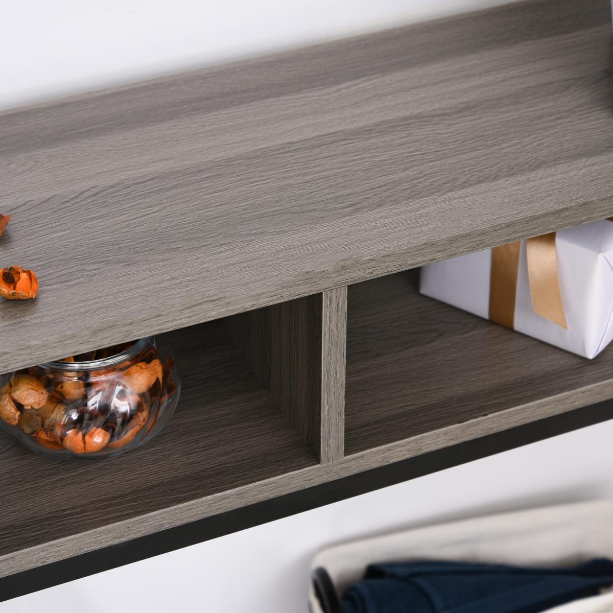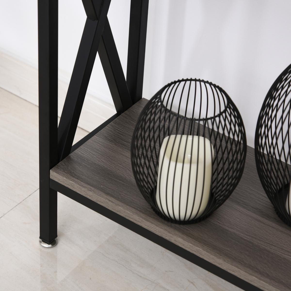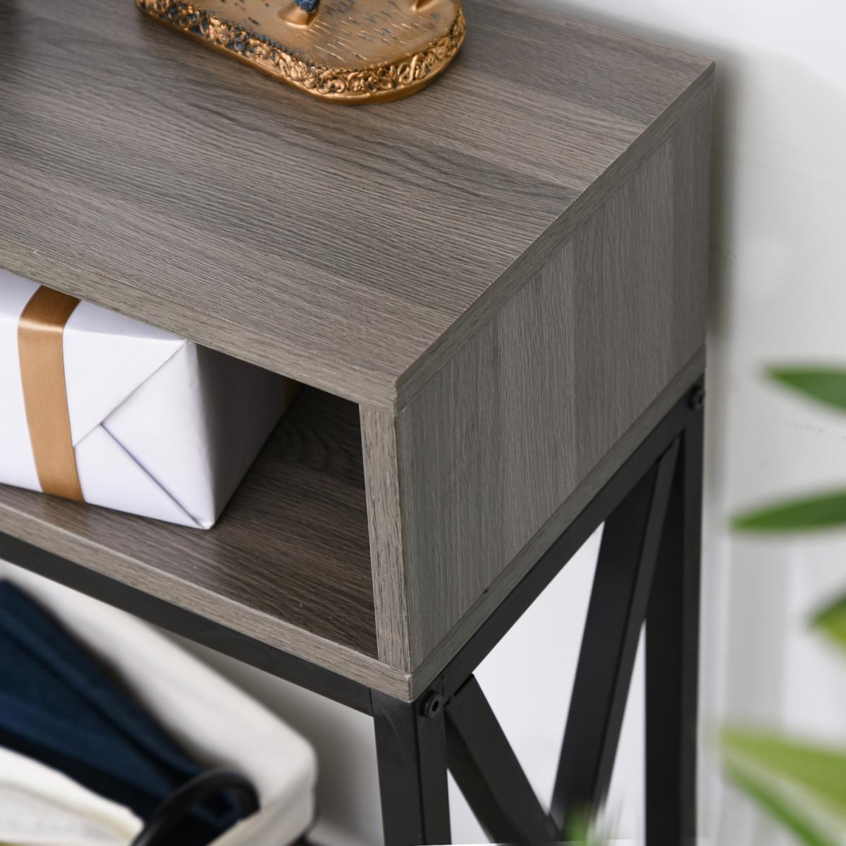 Bring a fresh feel into your home with this console table from HOMCOM. Using metal for the outer structure, it's made into a space-utilising design, where two small compartments are placed on the top, and a larger compartment is on the bottom - giving you plenty of room for storage and display. The shelves are made from particleboard in a thick finish for solid sturdiness, in a beautiful wood grain effect for a realistic look. Smooth in texture, it can be wiped clean for quick cleaning, with adjustable feet to ensure stability. A clean-cut design made to improve your home in style.