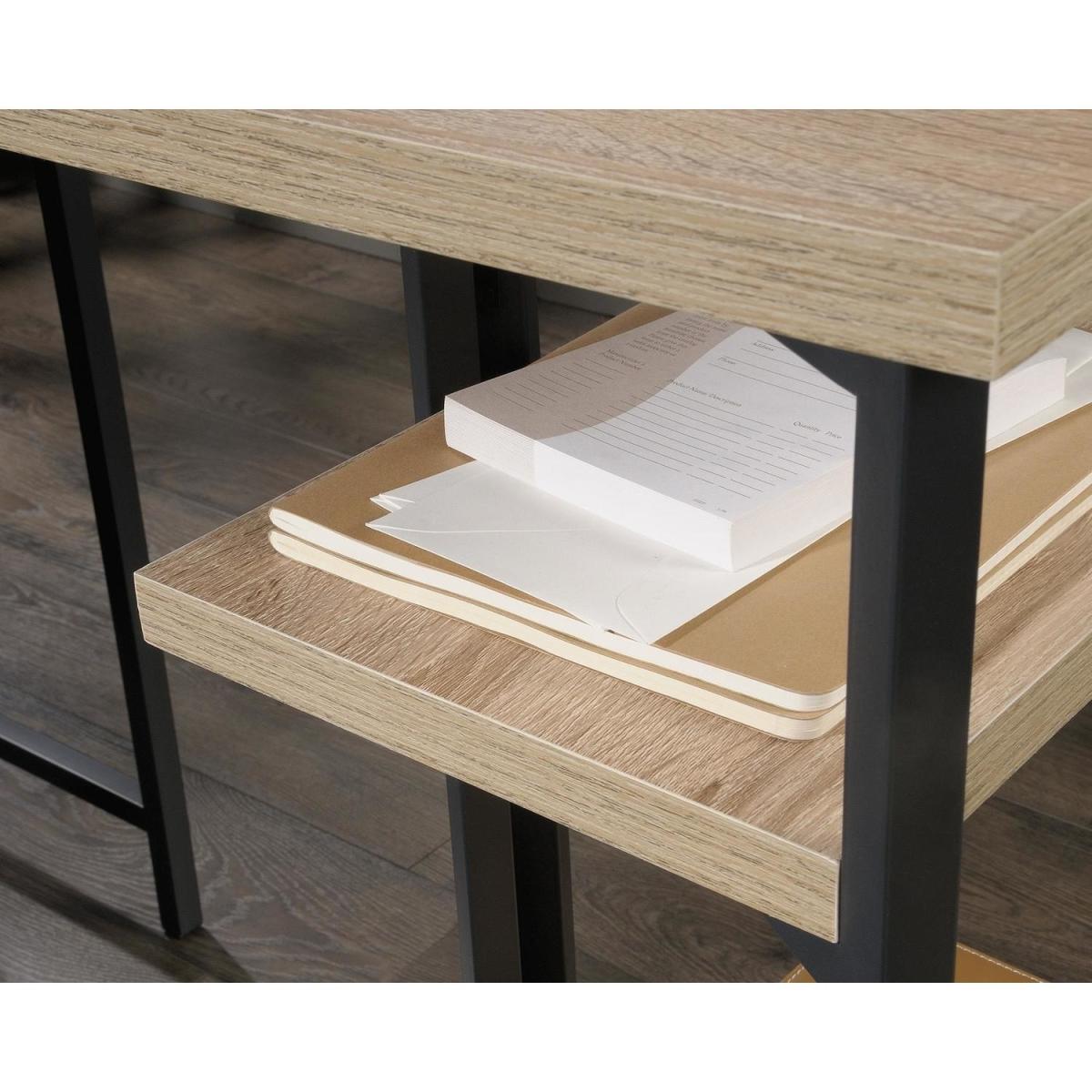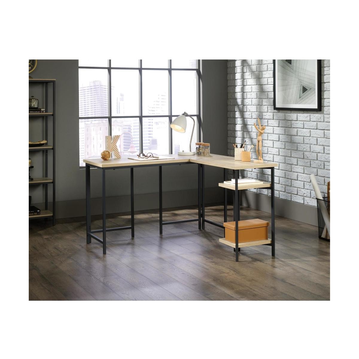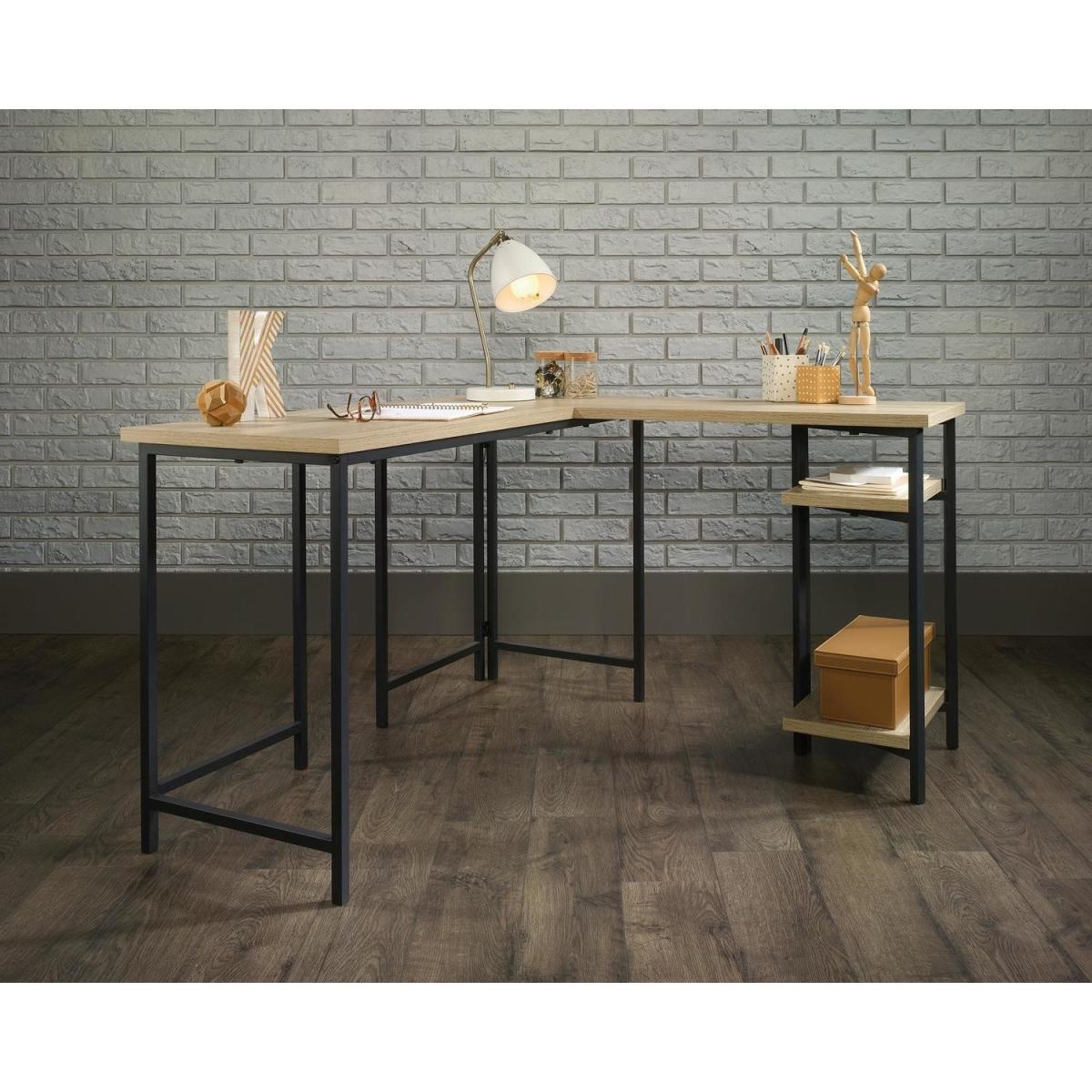Dimensions H72.4 x W119.4 x D120.5 cm. The Chunky Industrial Style L-Shaped Desk is an industrial style desk in an all-around Charter Oak finish. This desk offers a spacious work area and versatile storage space including open storage with fixed shelving. The large desk space provides a generous working area. Features. Home office Industrial style L-Shaped desk in Charter Oak Finish Sharp Minimalist design Desk and return provide a generous working area. Open storage with fixed shelving360 degree all round finish (can be freestanding)Durable black metal frame Assembly required..