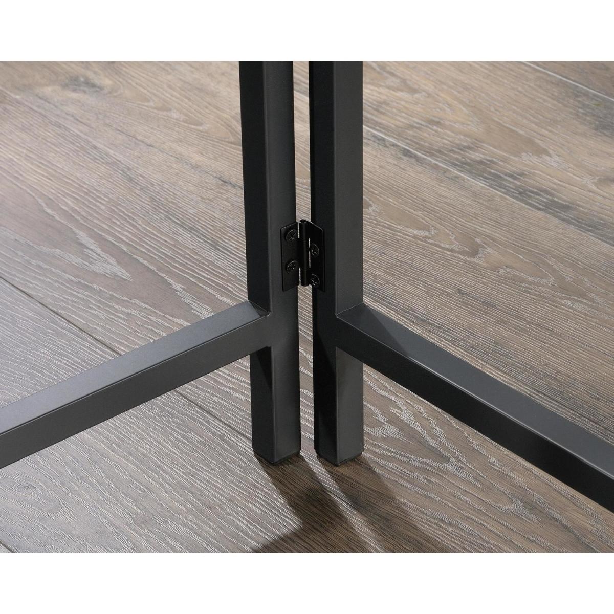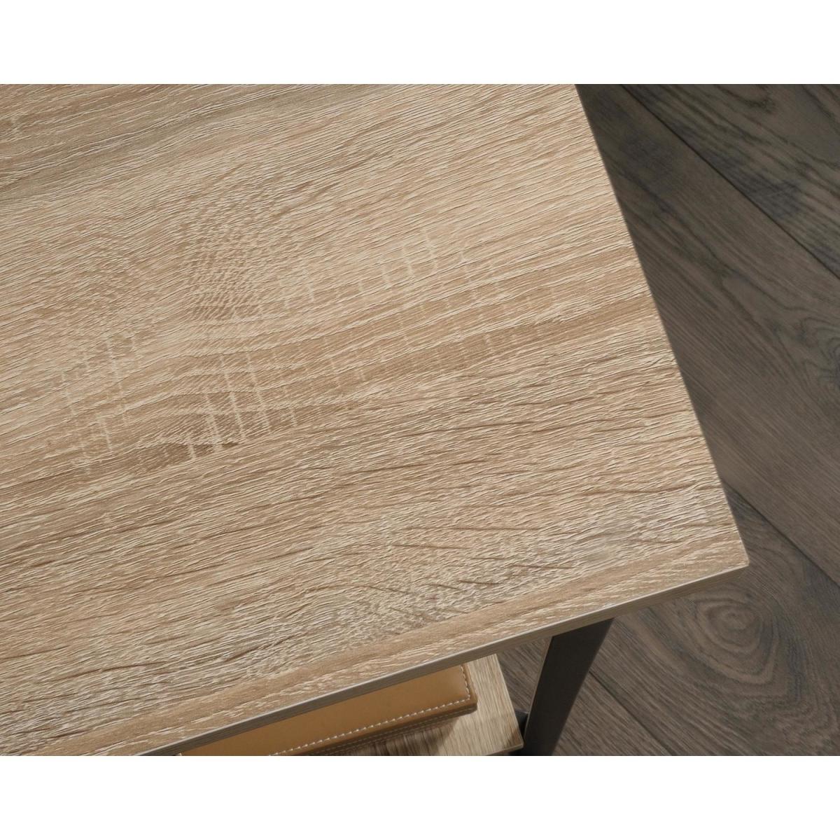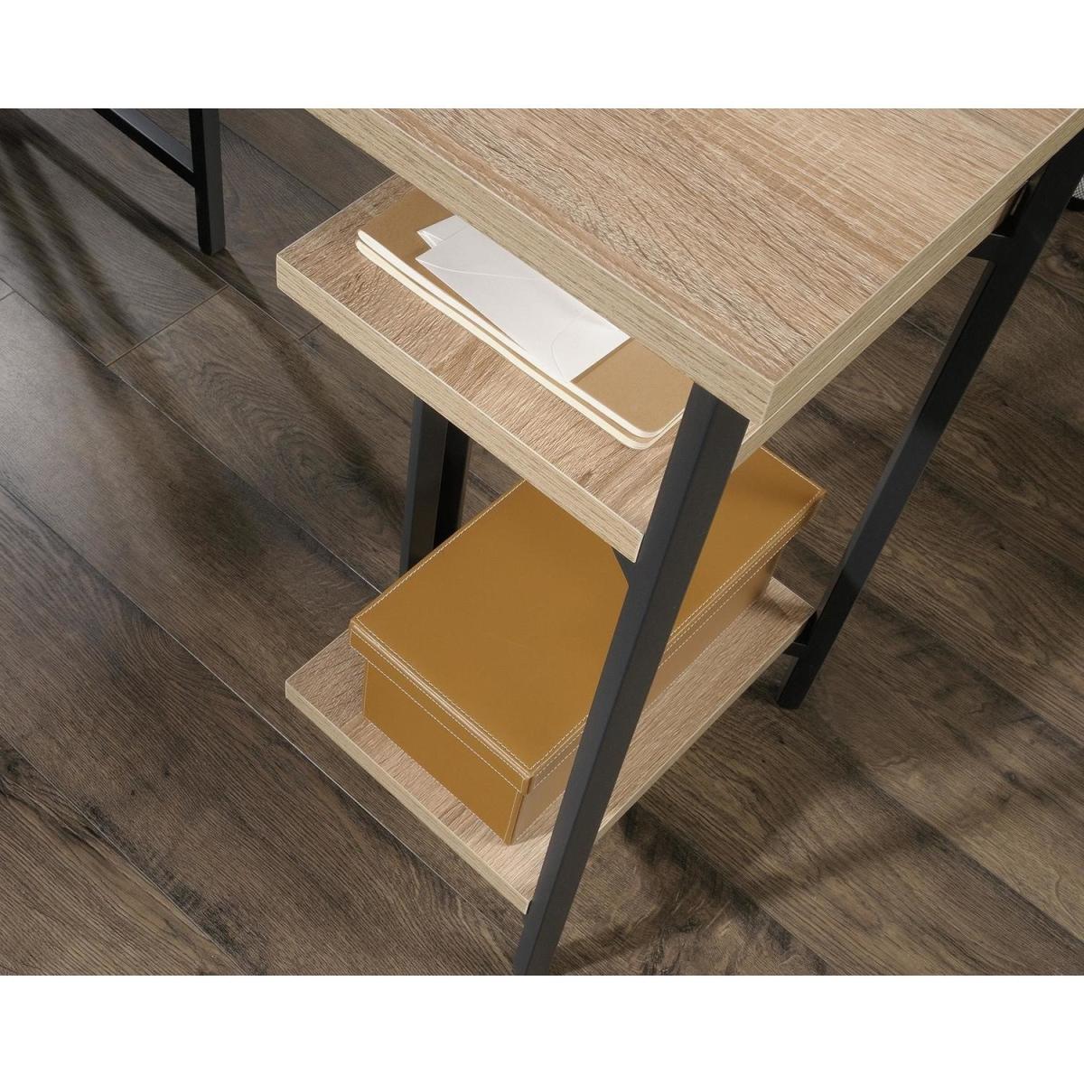 Dimensions H72.4 x W119.4 x D120.5 cm. The Chunky Industrial Style L-Shaped Desk is an industrial style desk in an all-around Charter Oak finish. This desk offers a spacious work area and versatile storage space including open storage with fixed shelving. The large desk space provides a generous working area. Features. Home office Industrial style L-Shaped desk in Charter Oak Finish Sharp Minimalist design Desk and return provide a generous working area. Open storage with fixed shelving360 degree all round finish (can be freestanding)Durable black metal frame Assembly required..