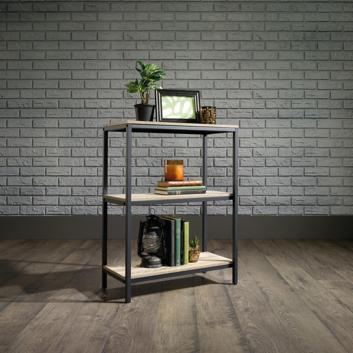 Dimensions. W59.6 x D29.2 x H77.4cm Features. Industrial style 2 shelf bookcase. Sharp minimalist design. Generous shelving space Charter oak effect tops. Durable black metal frame360 degree finish. Self assembly required..