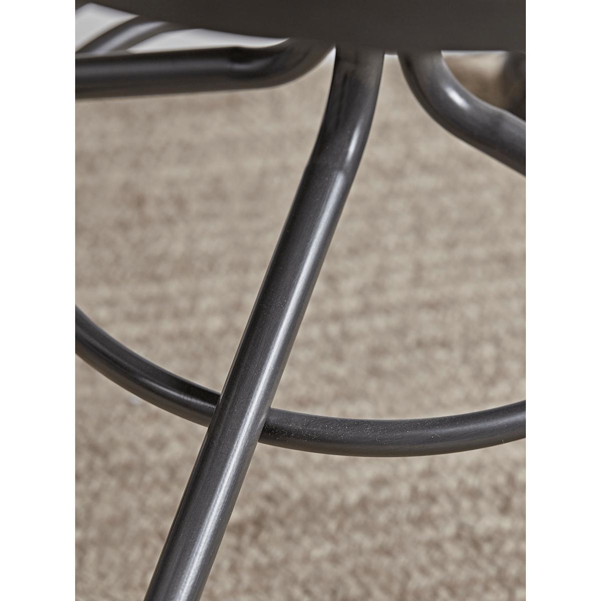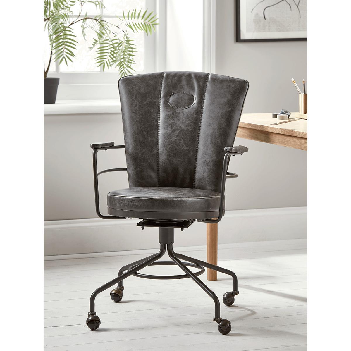 With a bold metal frame and sturdy base mounted on four castors for mobility, our statement desk chair will add a stylish touch to your home office. Each chair has padded arm rests for comfort and a cushioned seat, with faux leather upholstery in black, and an oval stitched detail to the backrest.